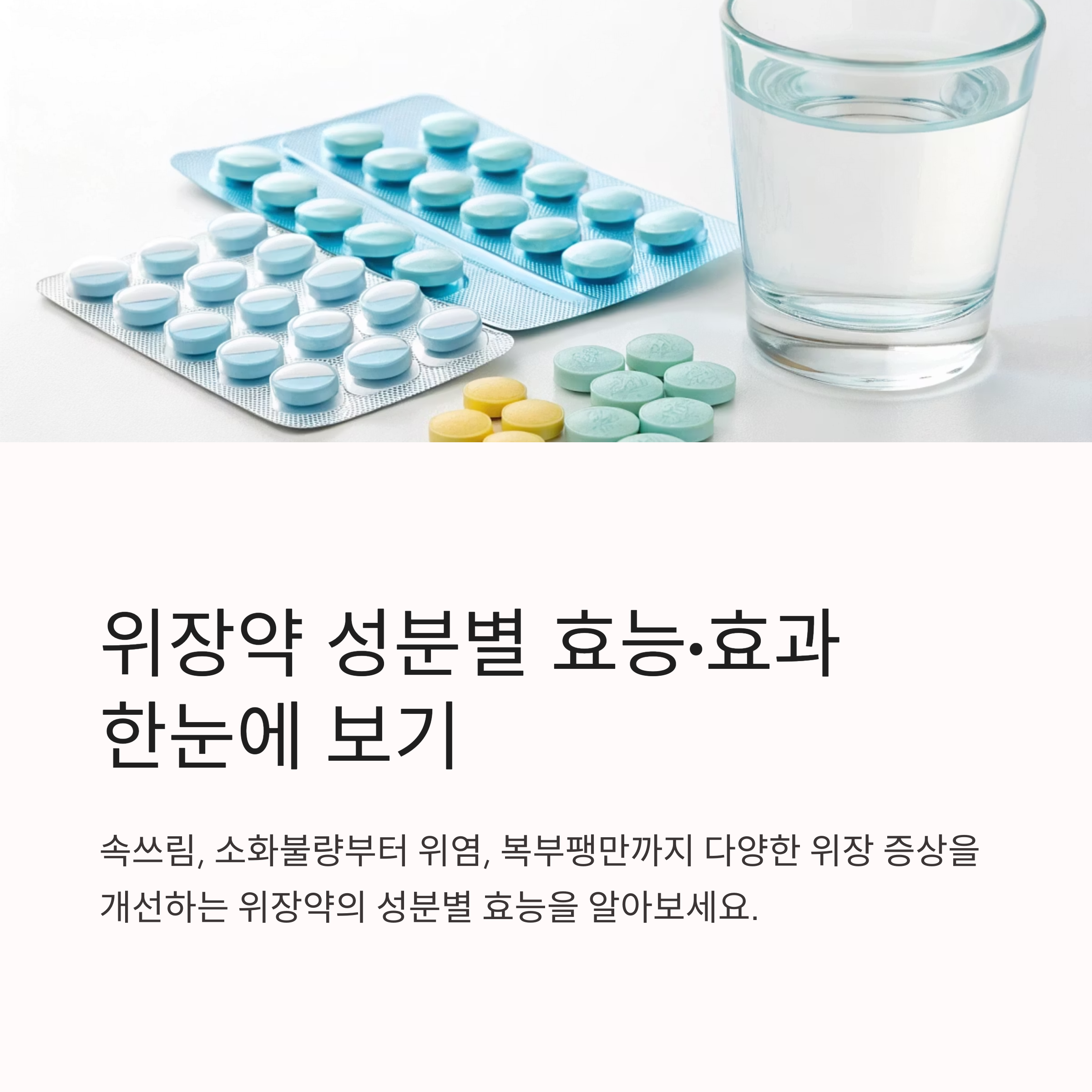 위장약은 속쓰림, 소화불량, 위염, 위통, 복부팽만 등 다양한 위장 증상을 개선하기 위해 사용되는 약물입니다. 제산제, 위산분비억제제, 소화효소제, 위장운동촉진제, 진경제, 생약성분 등 다양한 성분이 복합적으로 작용하여 위장 건강을 지키는 데 도움을 줍니다. 아래에서 대표적인 위장약 성분별 효능과 효과를 꼼꼼하게 안내합니다.