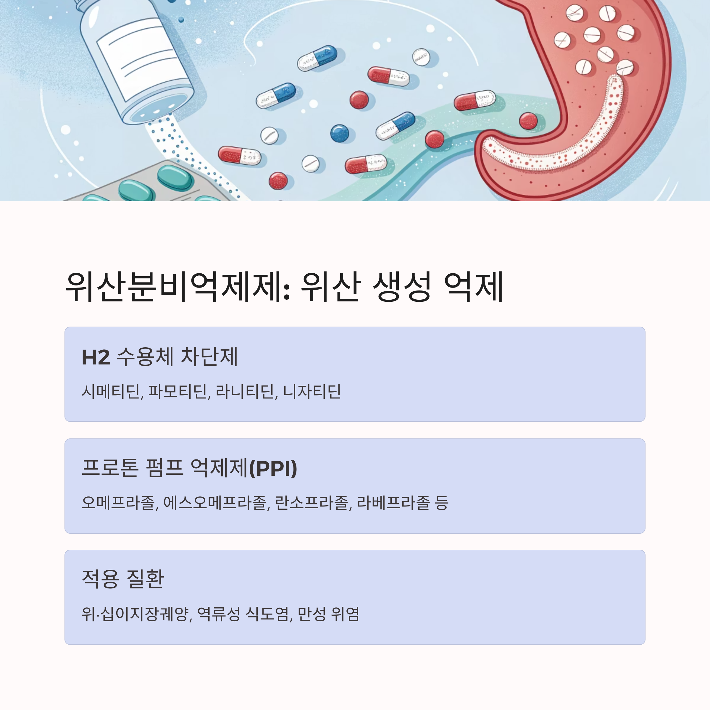 - 프로톤 펌프 억제제(PPI): 오메프라졸, 에스오메프라졸, 란소프라졸, 라베프라졸 등
