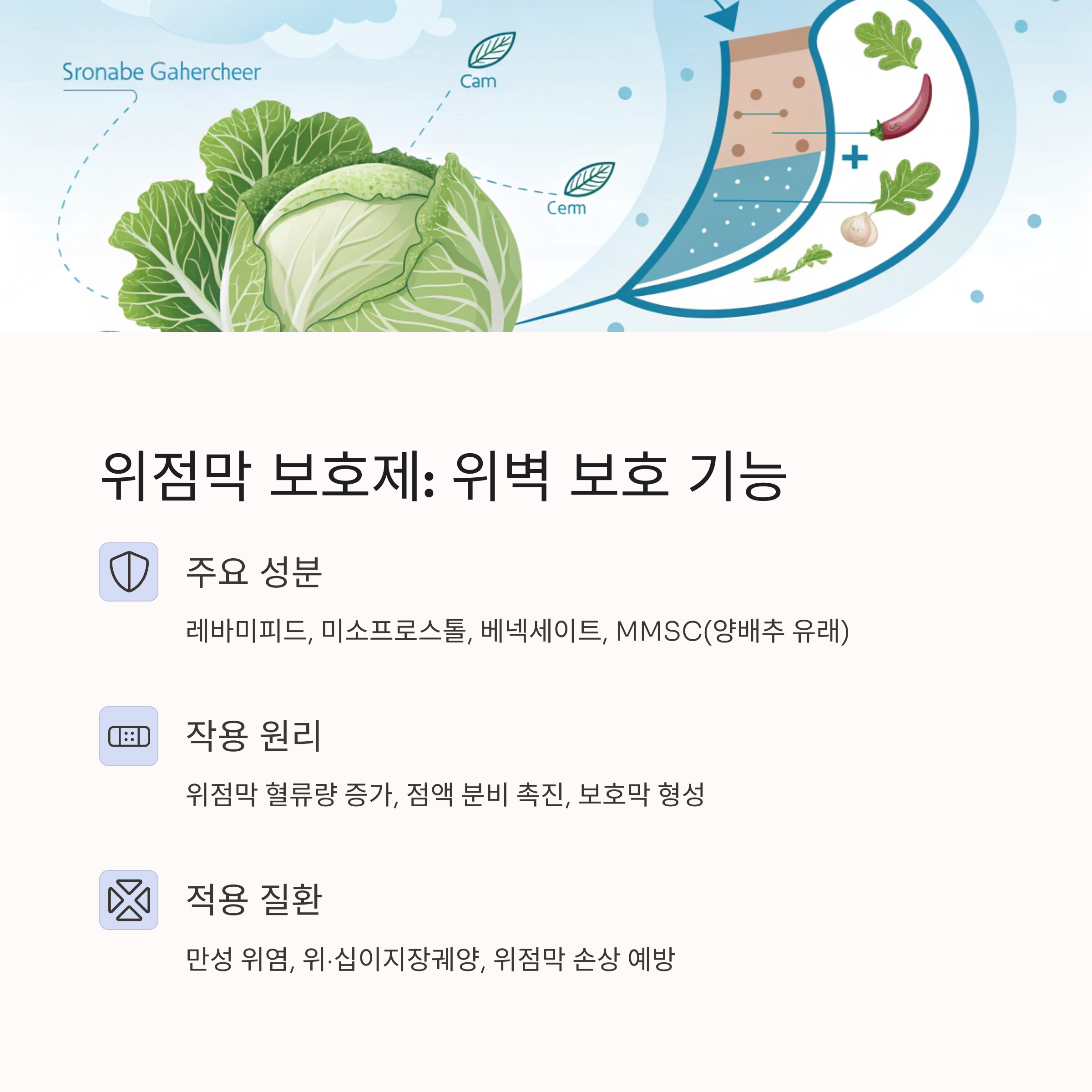 - 주요 성분: 레바미피드, 미소프로스톨, 베넥세이트, 메틸메티오닌설포늄염화물(MMSC, 양배추 유래), 스크랄페이트 등