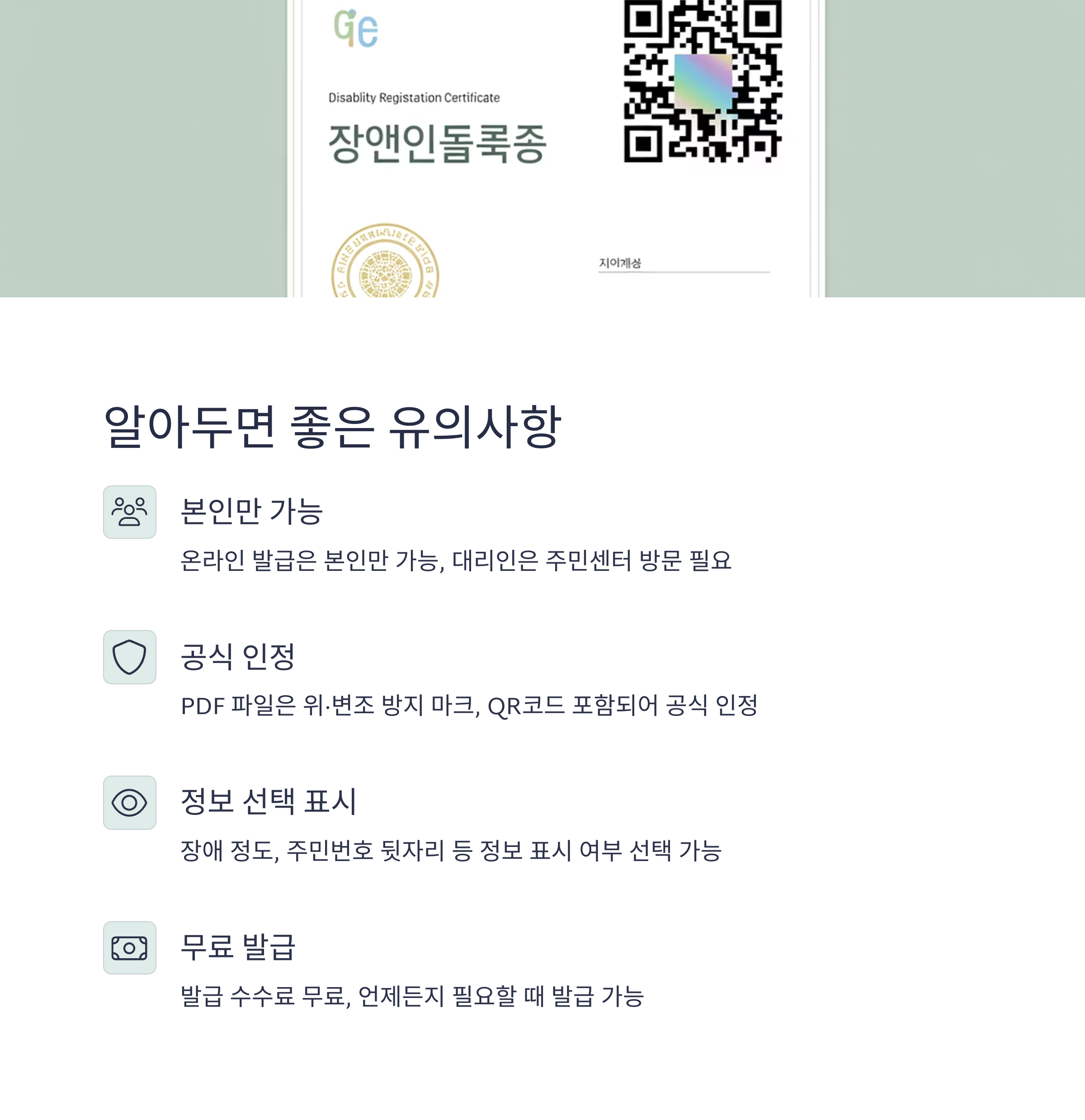 네, 위·변조 방지 마크, QR코드가 포함되어 있어 공식 서류로 인정됩니다 - Q. 장애 정도, 주민번호 뒷자리 등 정보는 선택 표시가 가능한가요?