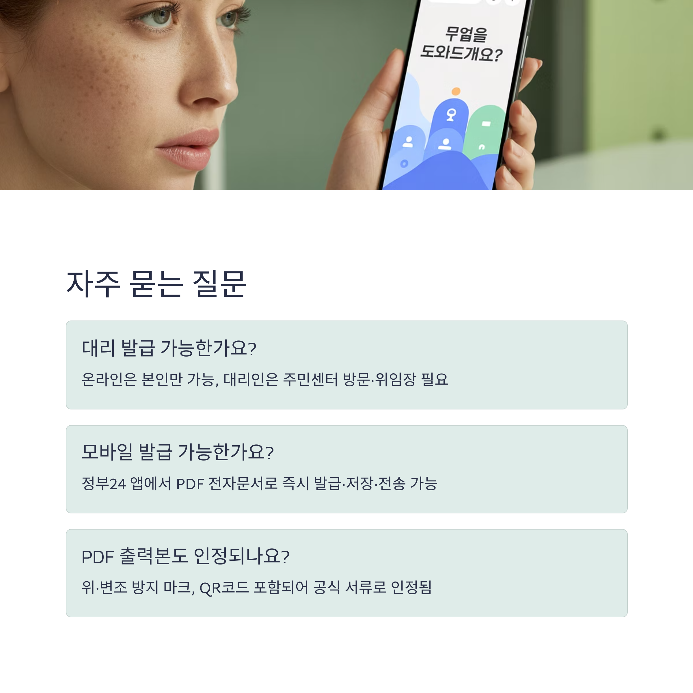 네, 본인만 가능하며, 대리인은 주민센터 방문·위임장 제출 필요 - Q. 모바일로도 발급 가능한가요?
