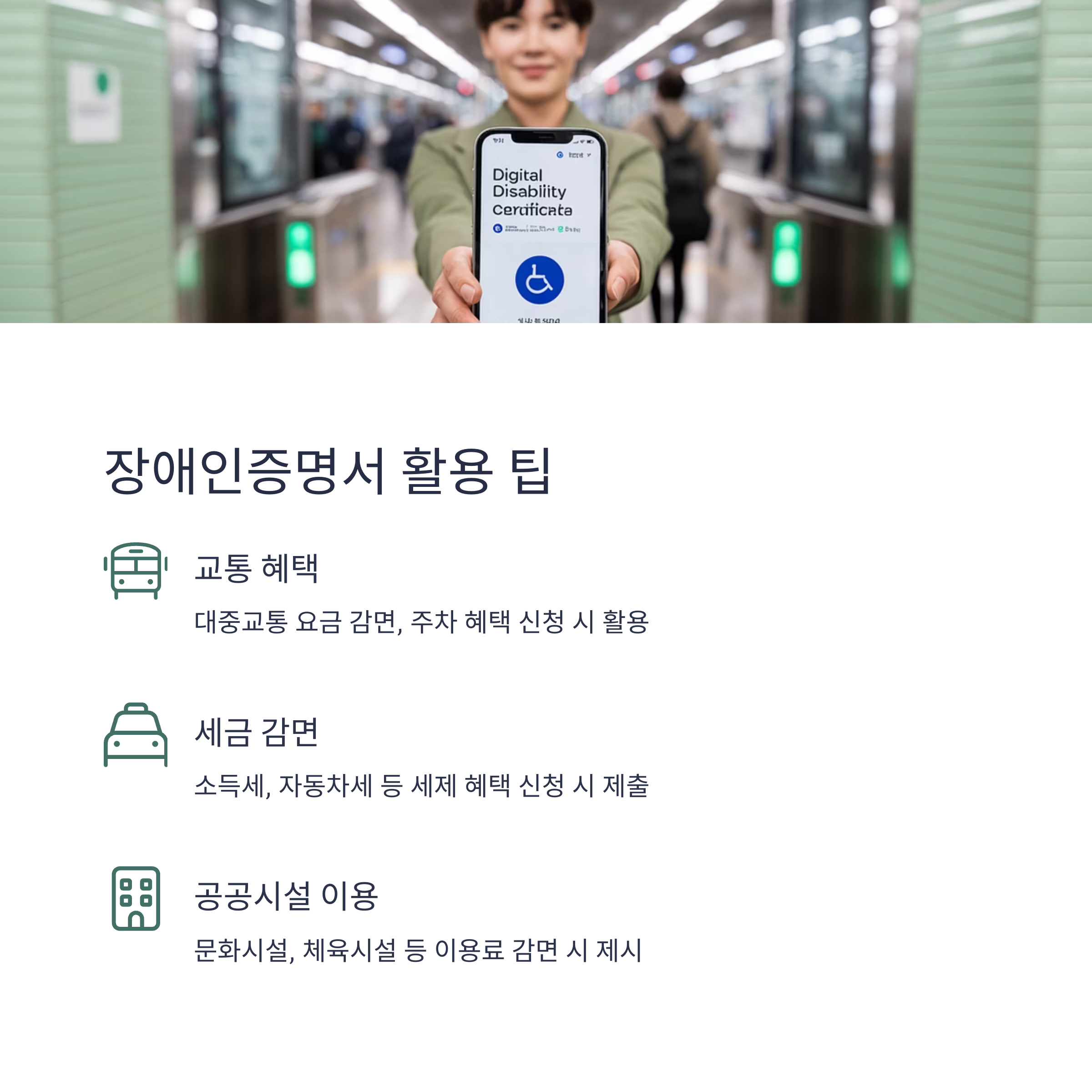 - 장애인등록증(사진 부착) 대체 불가, 임시 등록증 필요 시 별도 신청