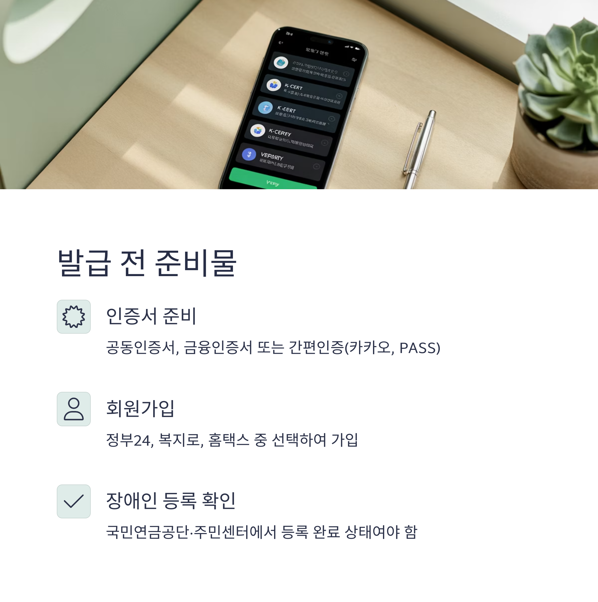 - 장애인 등록이 완료된 상태(국민연금공단·주민센터에서 등록 완료)