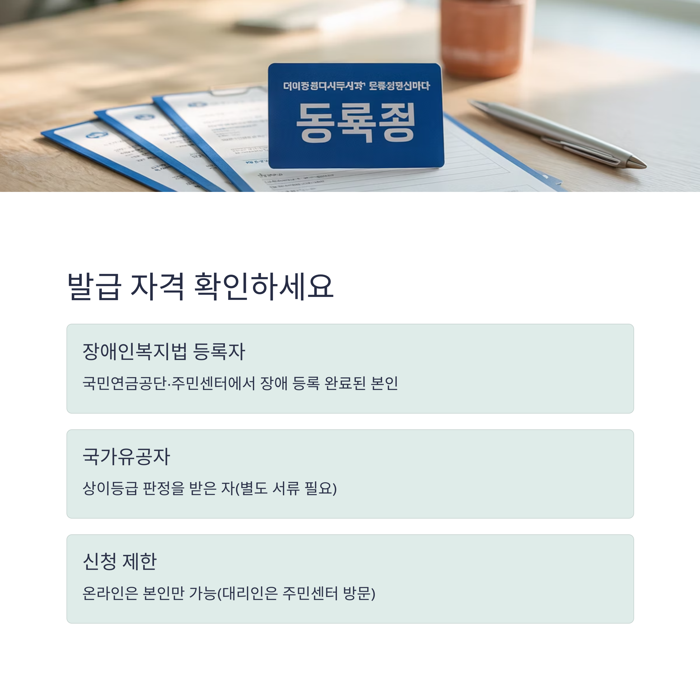 - 장애인복지법에 따라 장애 등록이 완료된 본인(국민연금공단·주민센터에서 등록 완료 필요)