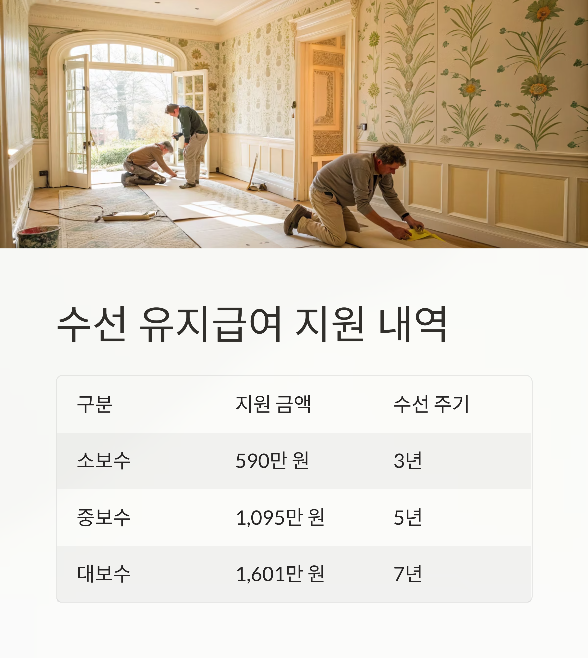 | 소보수 | 590만 원 | 3년 | 도배, 장판 교체 등 |