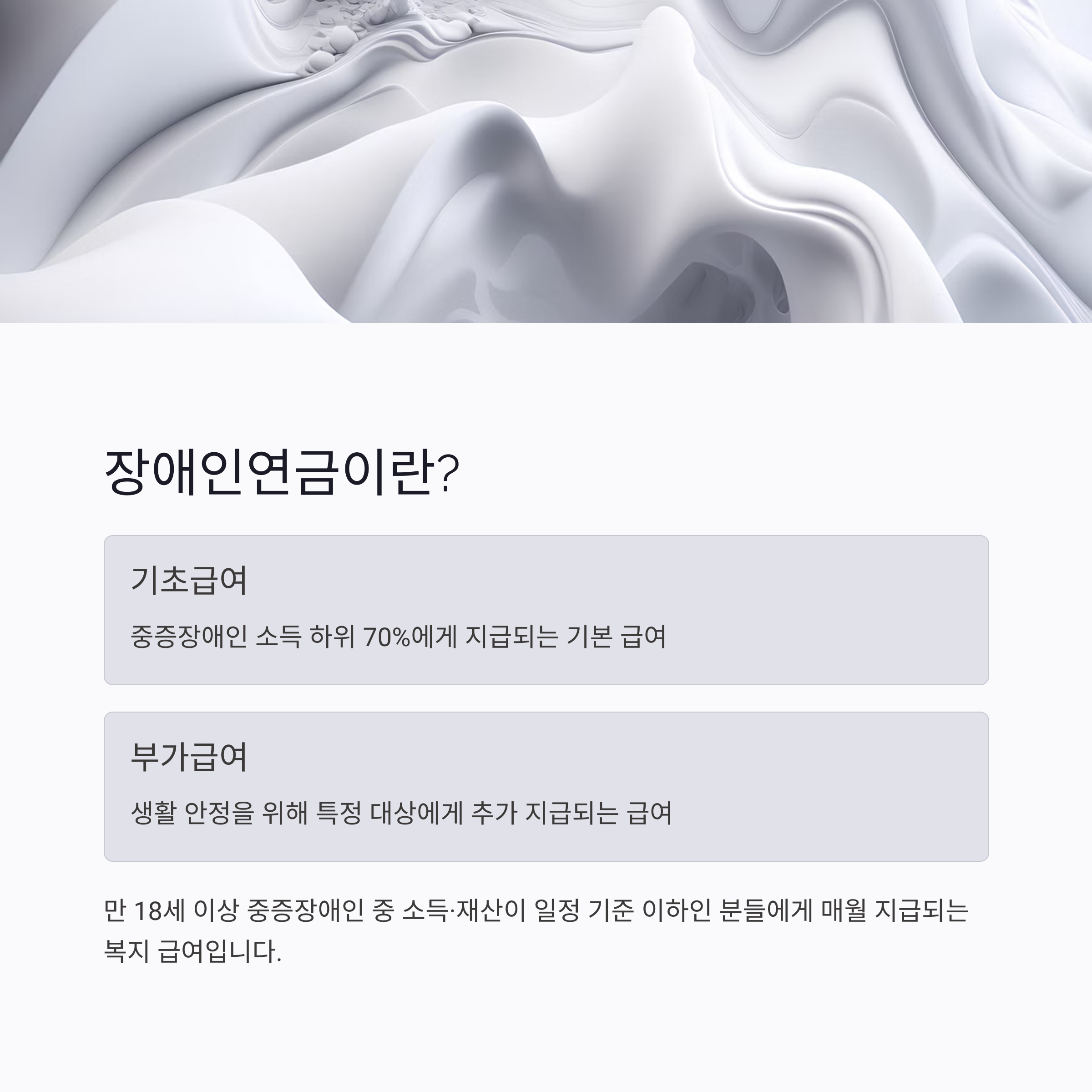 하지만 장애인연금은 모든 장애인에게 지급되는 것이 아니며, 대상이 되는 중증장애인 여부와 더불어 소득 및 재산 기준을 충족해야 합니다. 또한 신청 과정과 필요한 서류도 미리 알아두면 더욱 편리하게 진행할 수 있습니다. 이 글에서는 장애인연금의 수급 자격 요건, 특히 소득·재산 기준과 신청 방법, 절차 등에 대해 상세하게 안내해 드리겠습니다. 장애인연금 신청을 고려하고 계신 분들께 실질적인 도움이 되기를 바랍니다.