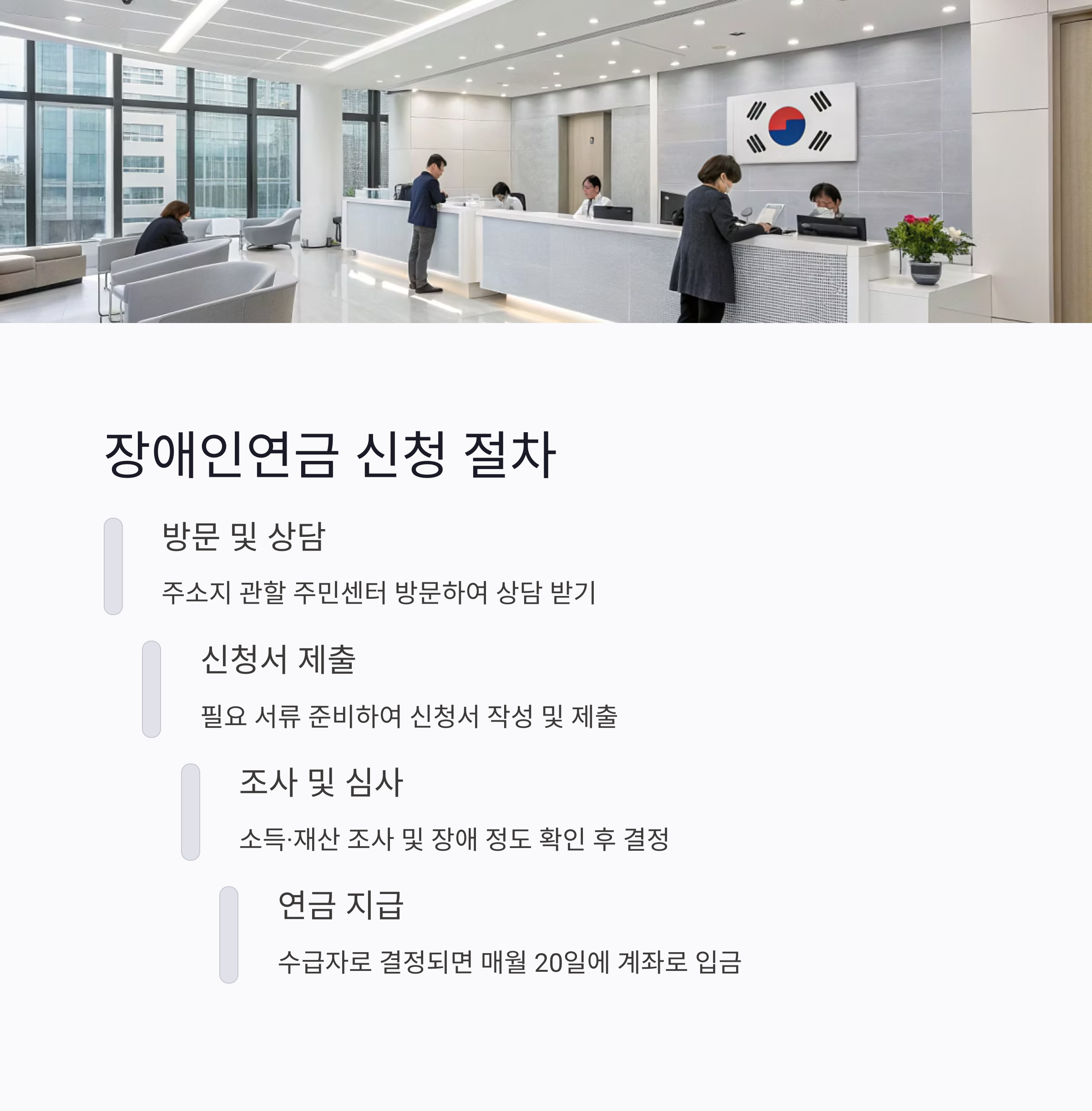 - 방문 및 상담: 주소지 관할 주민센터를 방문하여 장애인연금 신청 관련 상담을 받습니다. 자격 요건 및 필요한 서류에 대한 안내를 받을 수 있습니다.