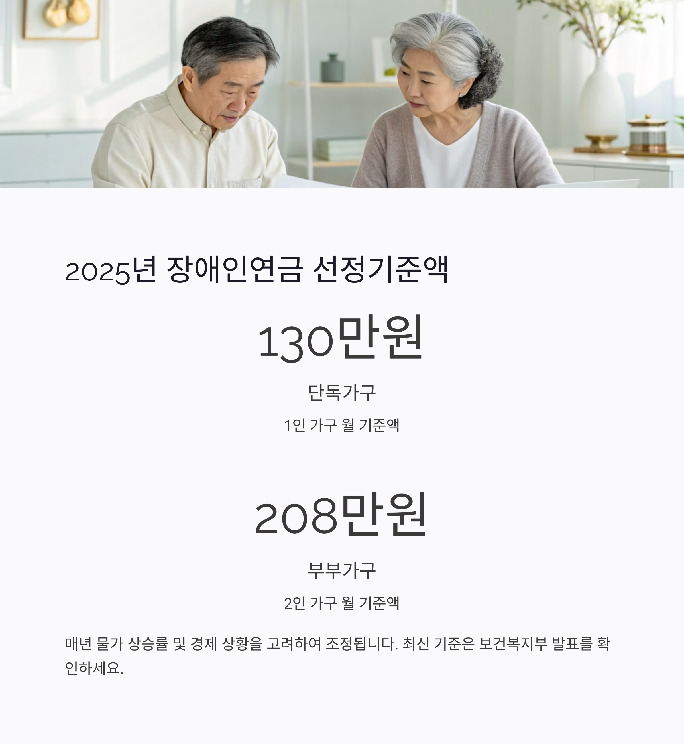 2025년 장애인연금 선정기준액은 단독가구의 경우 월 130만원, 부부가구의 경우 월 208만원(2024년 기준, 변동될 수 있음)입니다. 이 금액은 매년 물가 상승률 및 경제 상황 등을 고려하여 조정됩니다.