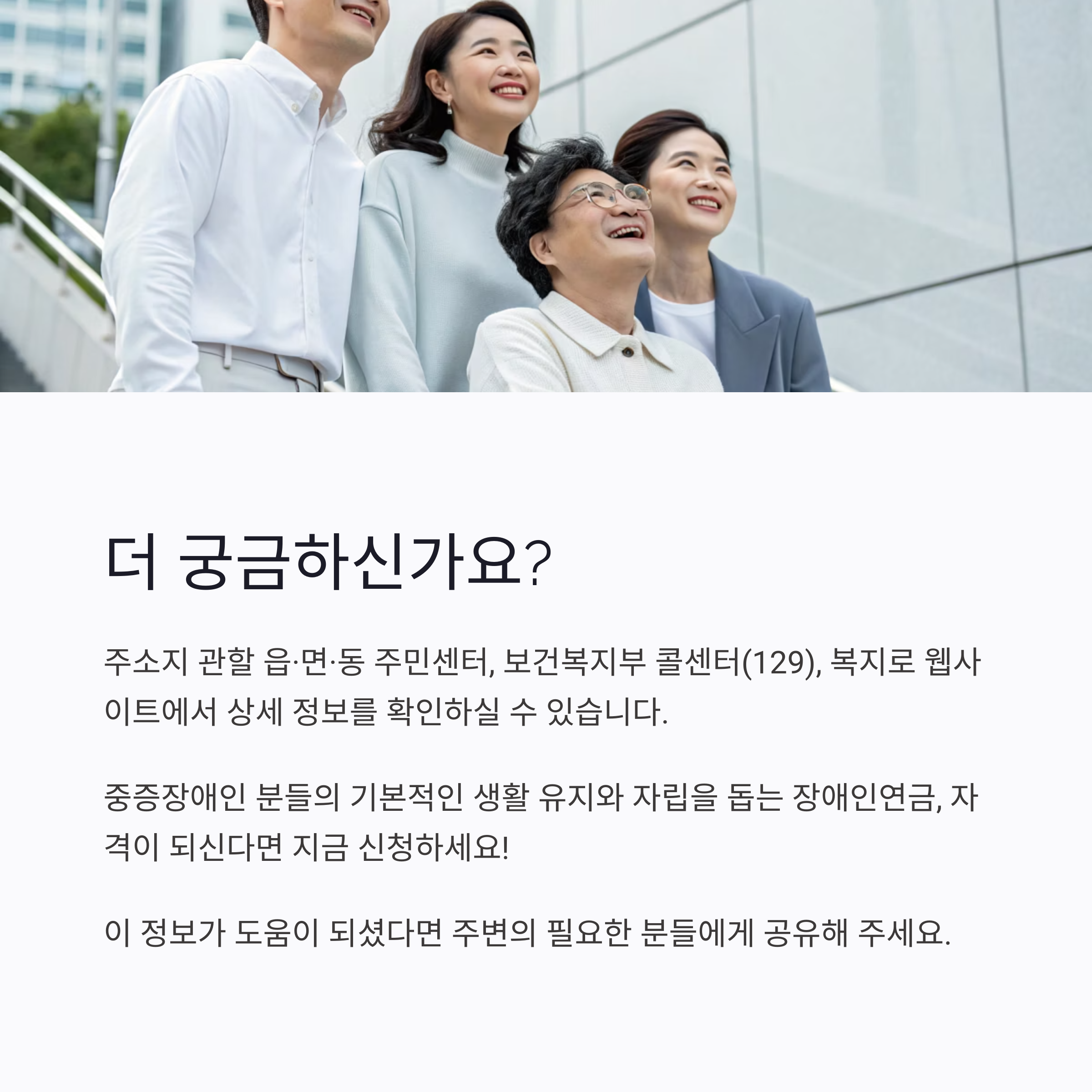 장애인연금은 중증장애인 분들이 사회 구성원으로서 기본적인 생활을 유지하고 자립하는 데 도움을 주는 소중한 제도입니다. 자격 요건에 해당되시는 분들은 안내된 내용을 참고하시어 적극적으로 신청하시기 바랍니다. 이 글이 장애인연금 신청에 어려움을 느끼셨던 분들께 작은 등불이 되기를 바랍니다.