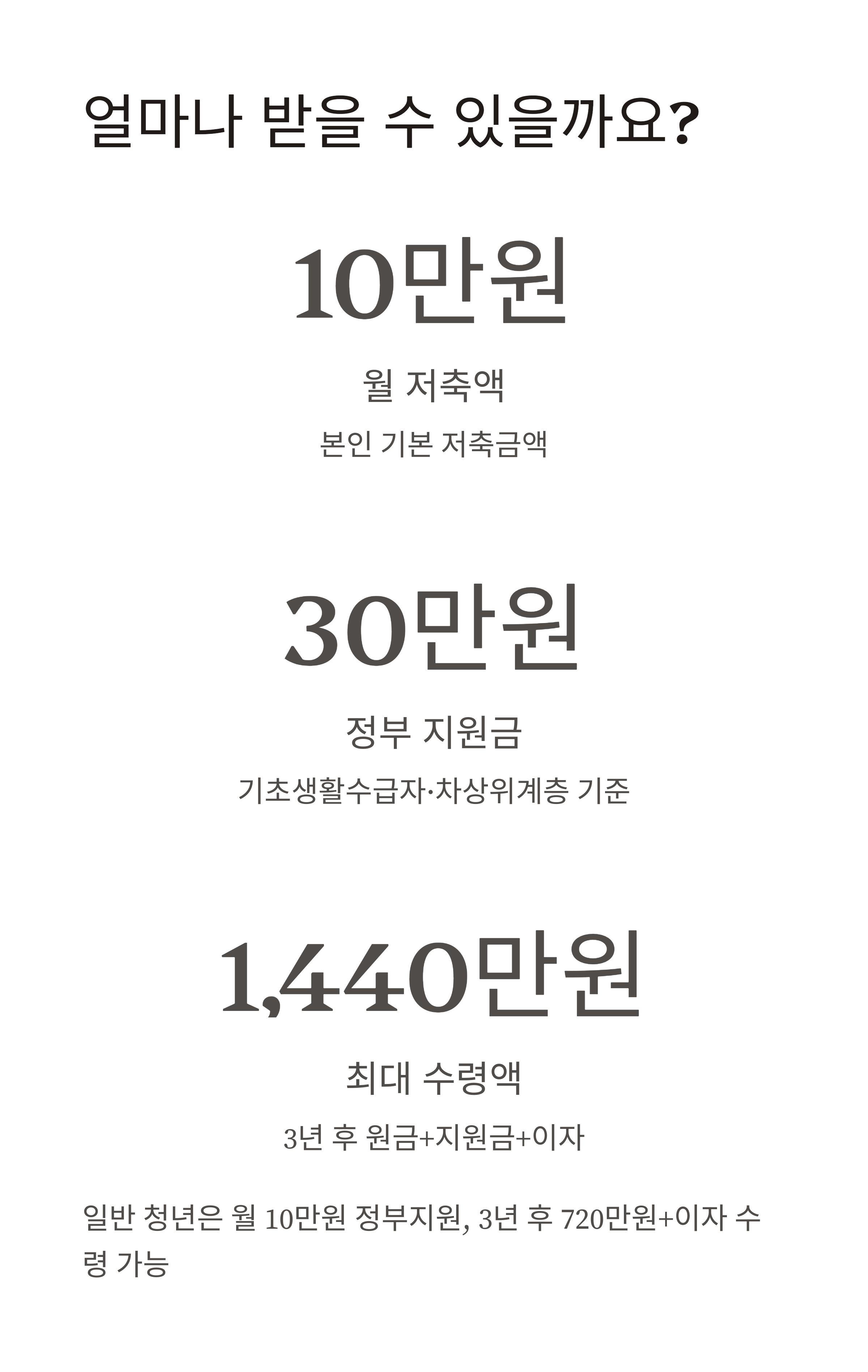 - 월 저축액: 본인 월 10만 원 저축(최대 50만 원까지 가능, 정부지원금은 10만 원 기준)