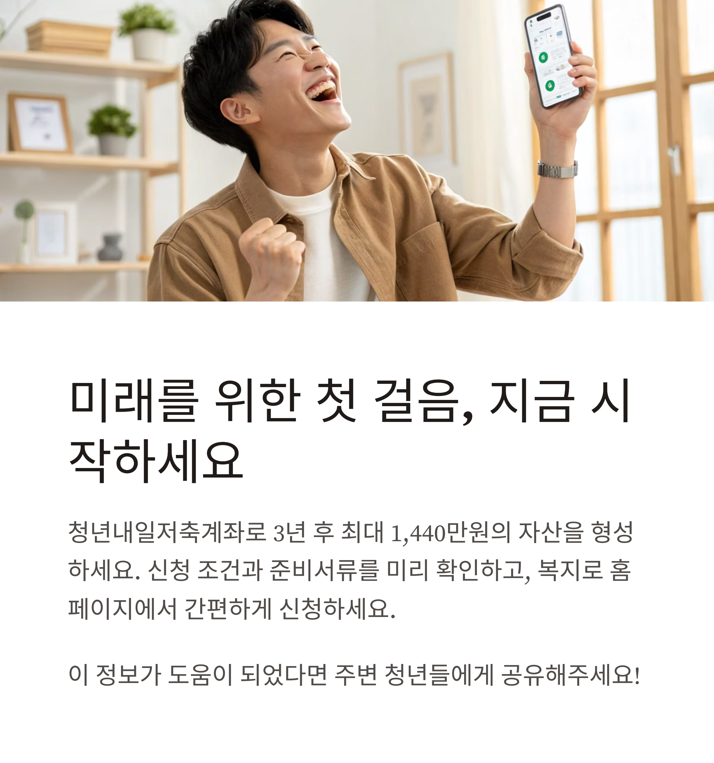 청년내일저축계좌는 저소득 청년의 자산 형성과 미래 준비에 큰 힘이 되는 정책입니다. 신청 조건과 준비서류를 미리 확인하고, 복지로 홈페이지에서 간편하게 신청하세요. 3년간 근로활동 유지, 교육 이수, 자금사용계획서 제출 등 만기 조건도 꼭 챙기시길 바랍니다.