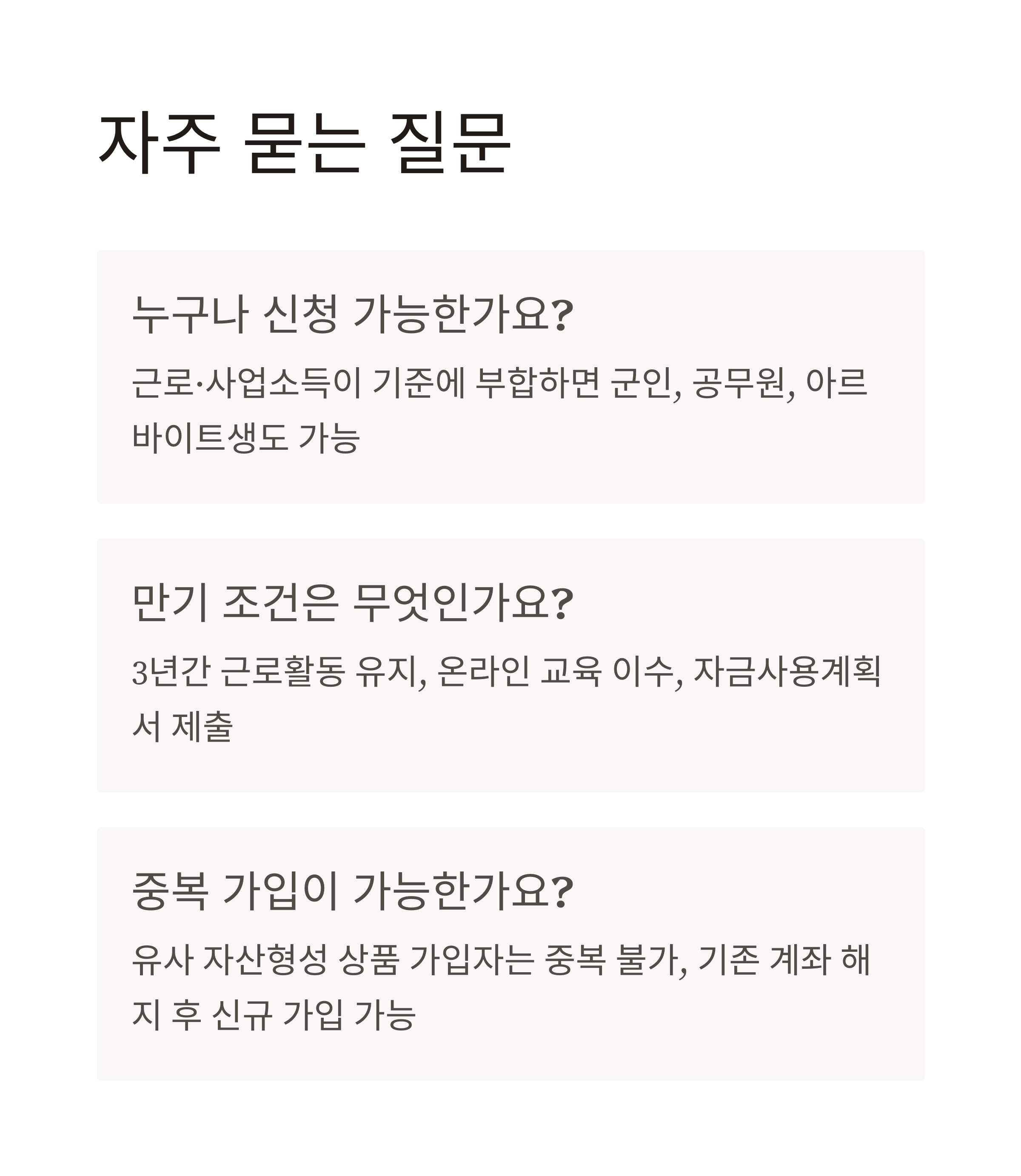 - 만기 조건: 3년간 근로활동 유지, 온라인 교육 10시간 이수, 만기 6개월 전 자금사용계획서 제출