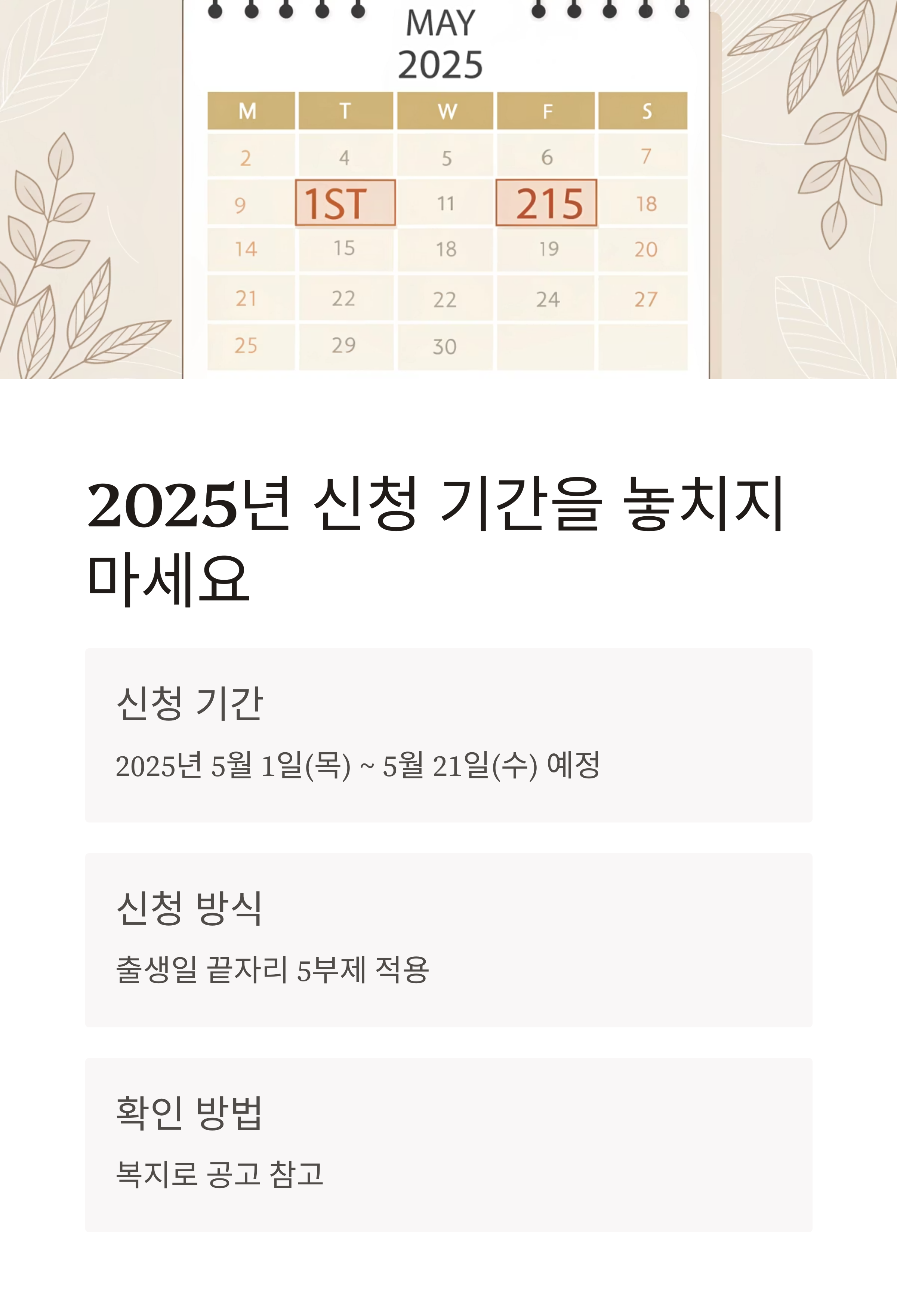 - 출생일 끝자리 5부제 등 세부 일정은 복지로 공고 참고