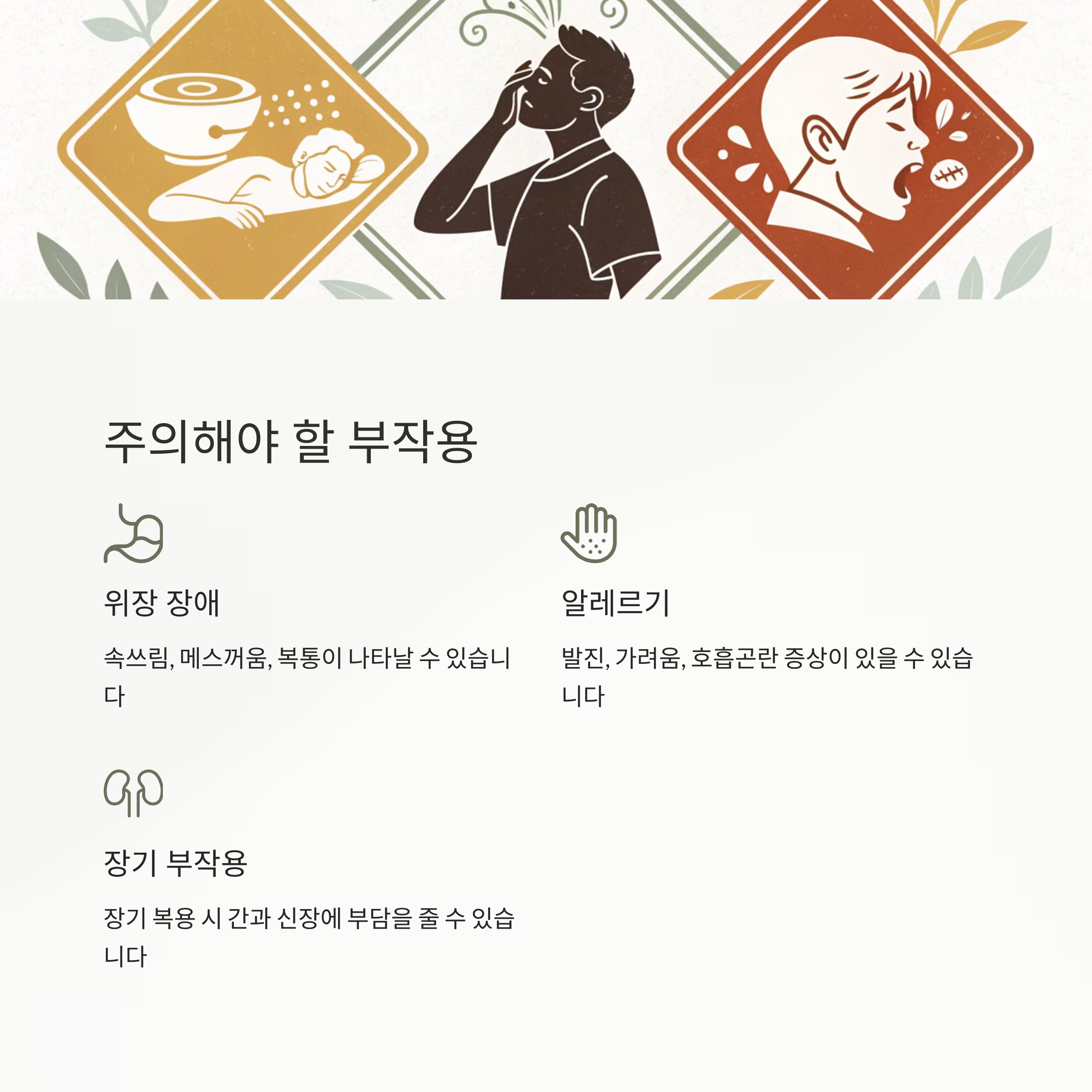 캐롤에프정의 주요 부작용으로는 속쓰림, 메스꺼움, 복통 등이 있으며, 드물게 알레르기 반응(발진, 가려움, 호흡곤란)이 나타날 수 있습니다. 위장 장애가 있는 분, 천식 환자, 신장 질환자는 복용 전 반드시 전문가 상담을 받아야 합니다. 장기 복용은 권장되지 않으며, 일시적 증상 완화 용도로 사용해야 합니다.