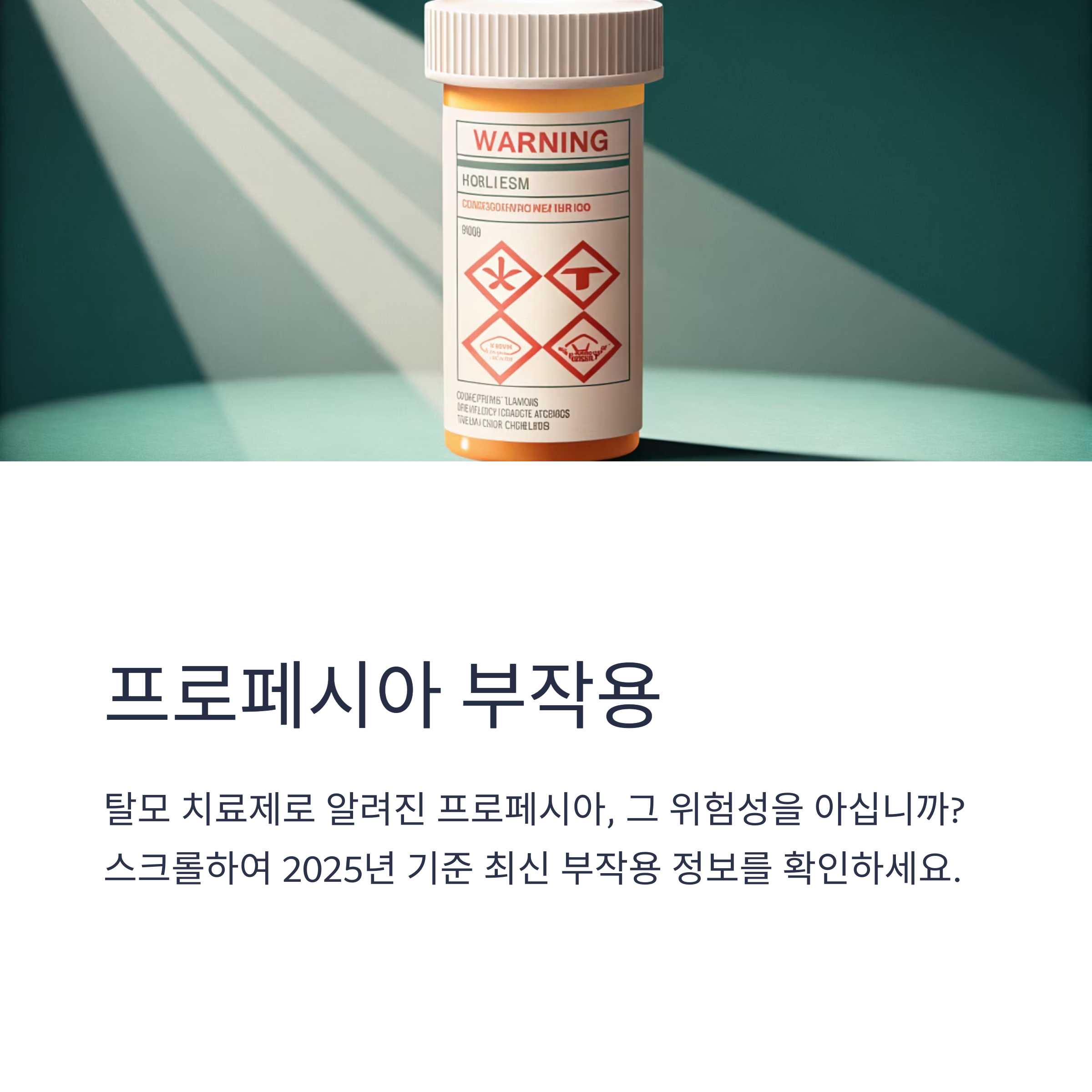 프로페시아는 효과가 입증된 탈모 치료제이지만, 성기능 저하, 우울증, 자살 충동 등 심각한 부작용이 일부에서 나타날 수 있습니다. 복용 전 반드시 의료진과 상담하고, 복용 중 신체·정신 변화가 있다면 즉시 전문가의 진료를 받으세요.
