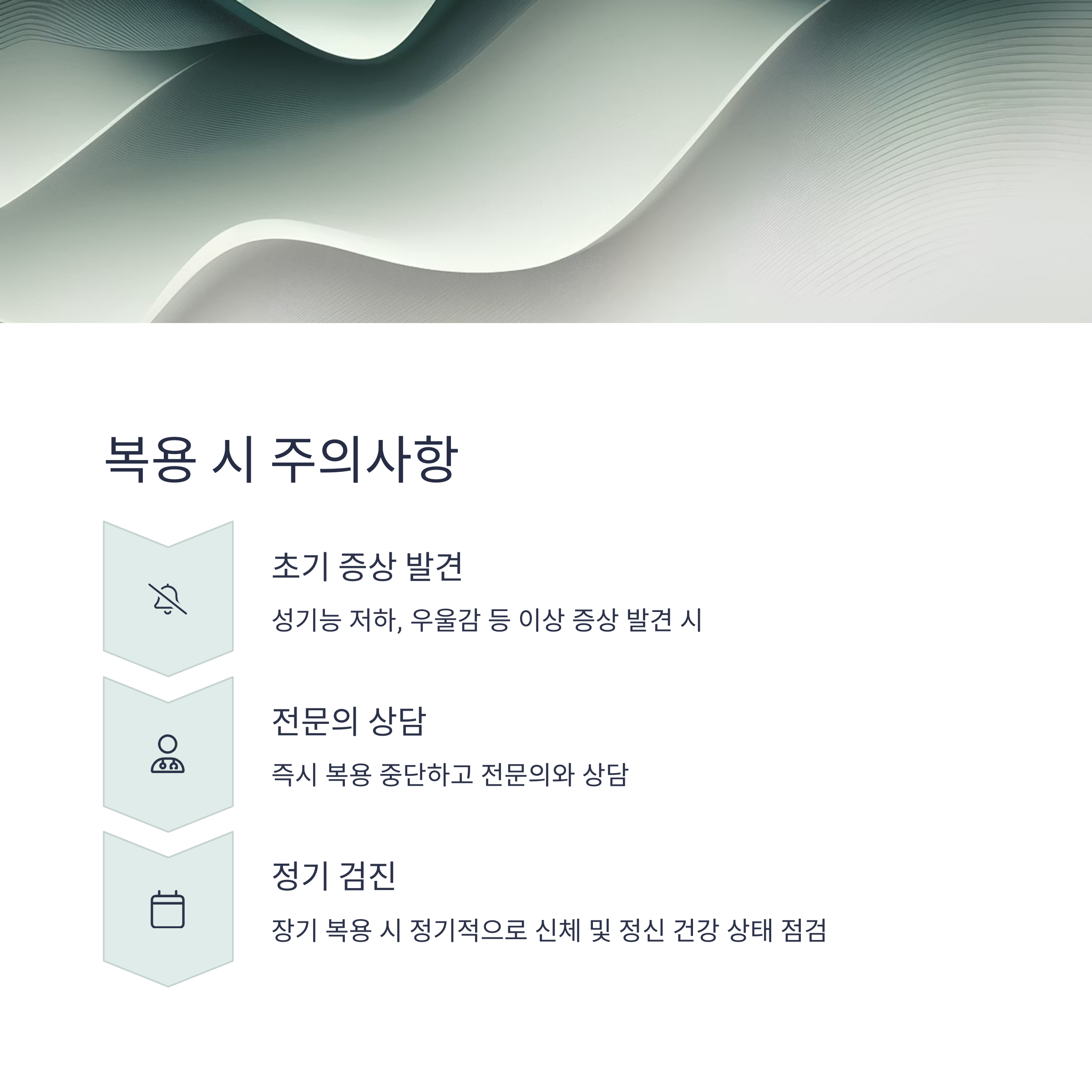 - 복용 초기에 성기능 저하, 우울감 등 이상 증상이 나타나면 즉시 복용을 중단하고 전문의와 상담