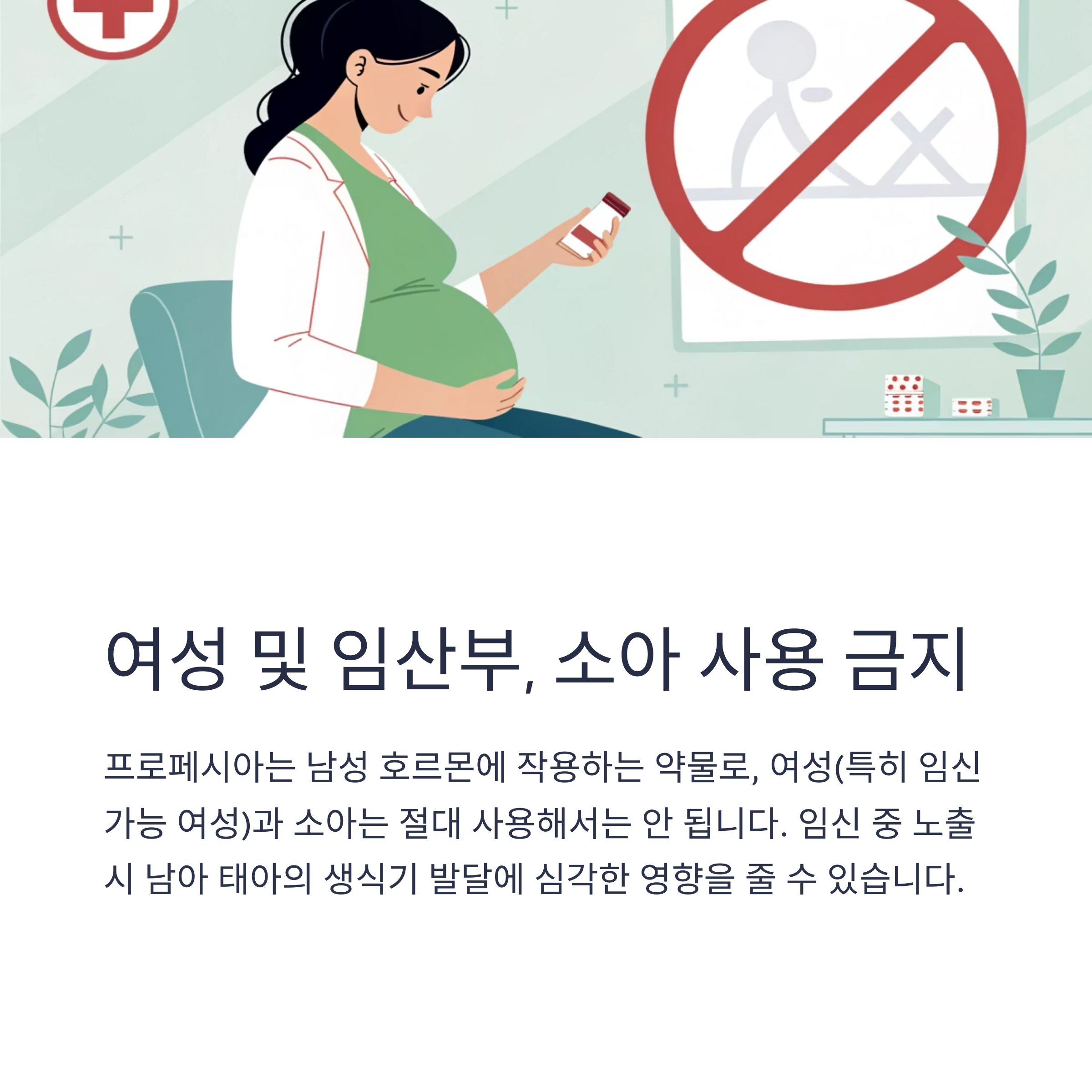 - 프로페시아는 남성 호르몬에 작용하는 약물로, 여성(특히 임신 가능 여성)과 소아는 절대 사용해서는 안 됨