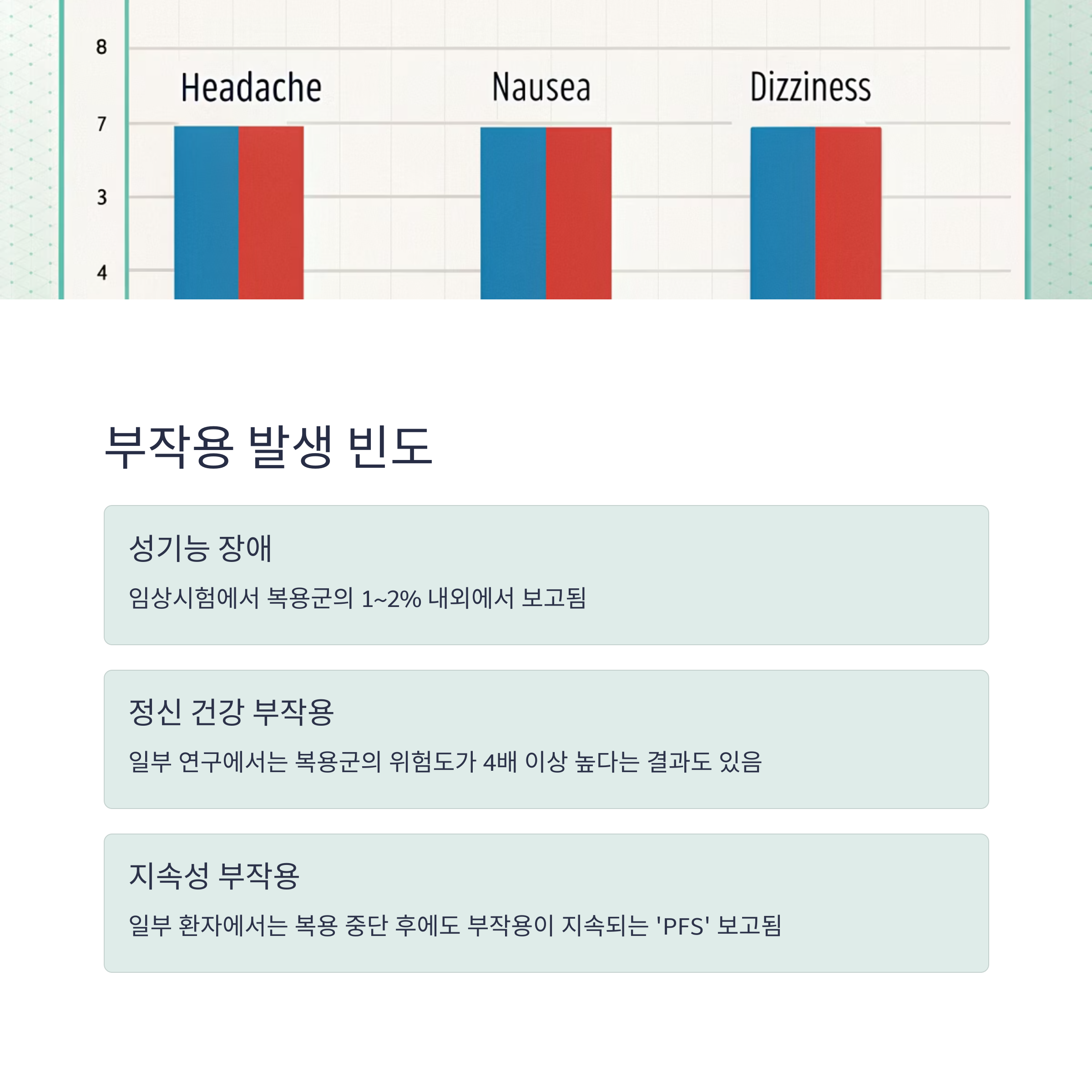 A. 성기능 장애는 약 1~2%에서, 정신 건강 부작용은 최근 보고가 늘고 있으나 전체 환자 중 일부에서 발생합니다. 개인별 차이가 크므로 신체 변화를 유심히 관찰해야 합니다. - Q. 부작용이 나타나면 어떻게 해야 하나요?