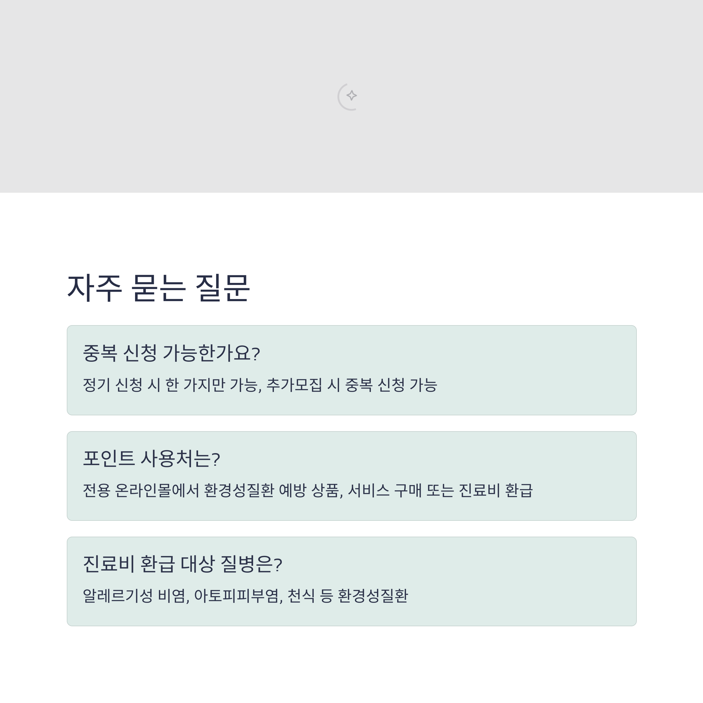 전용 온라인몰에서 환경성질환 예방 상품, 서비스 구매 또는 진료비 환급에 사용할 수 있습니다. - Q. 진료비 환급은 어떤 질병에 해당하나요?