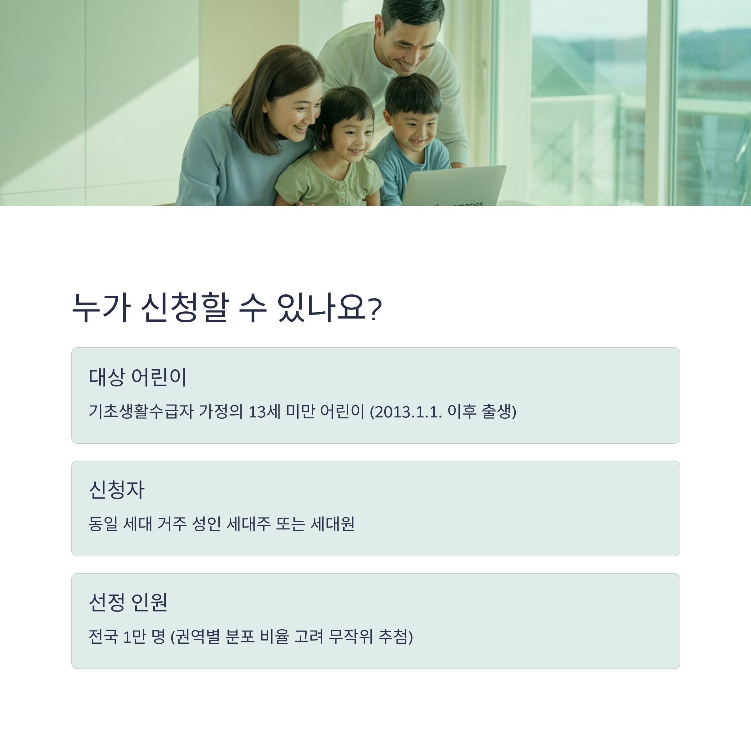 - 신청 대상: 기초생활수급자 가정의 13세 미만(2013.1.1. 이후 출생) 어린이