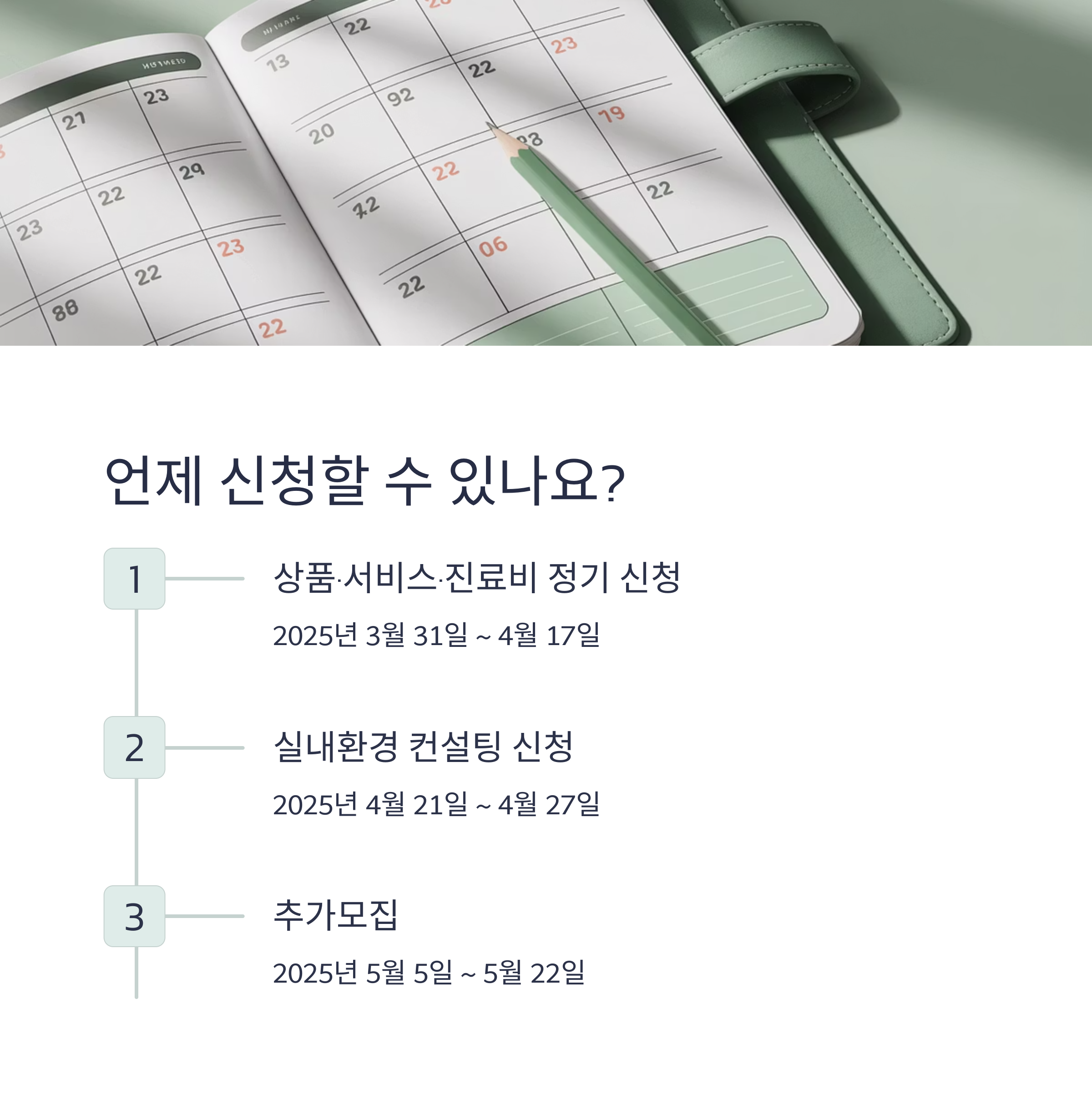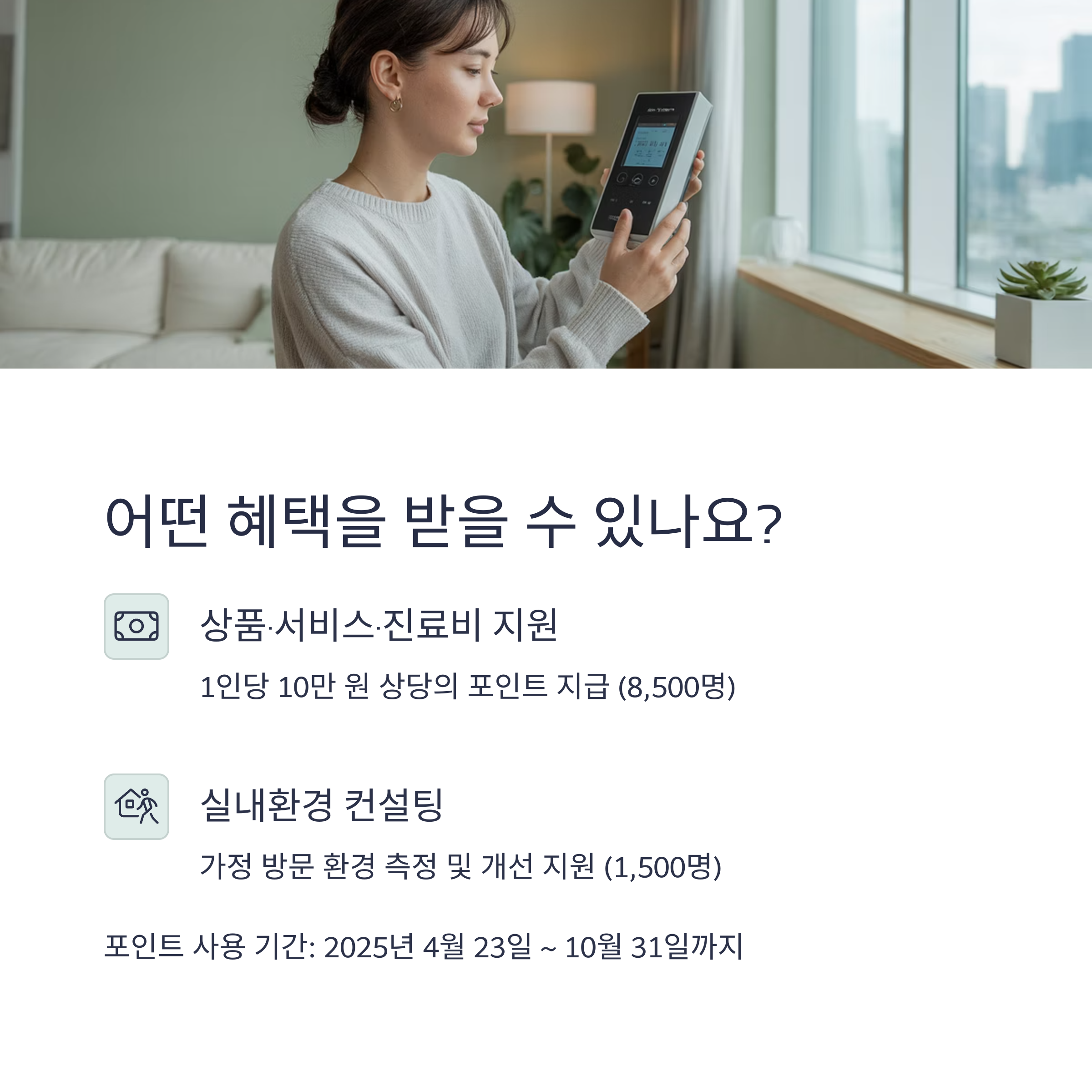 - 추가모집: 2025년 5월 5일 ~ 5월 22일(실내환경 컨설팅 선정자도 중복 신청 가능)
