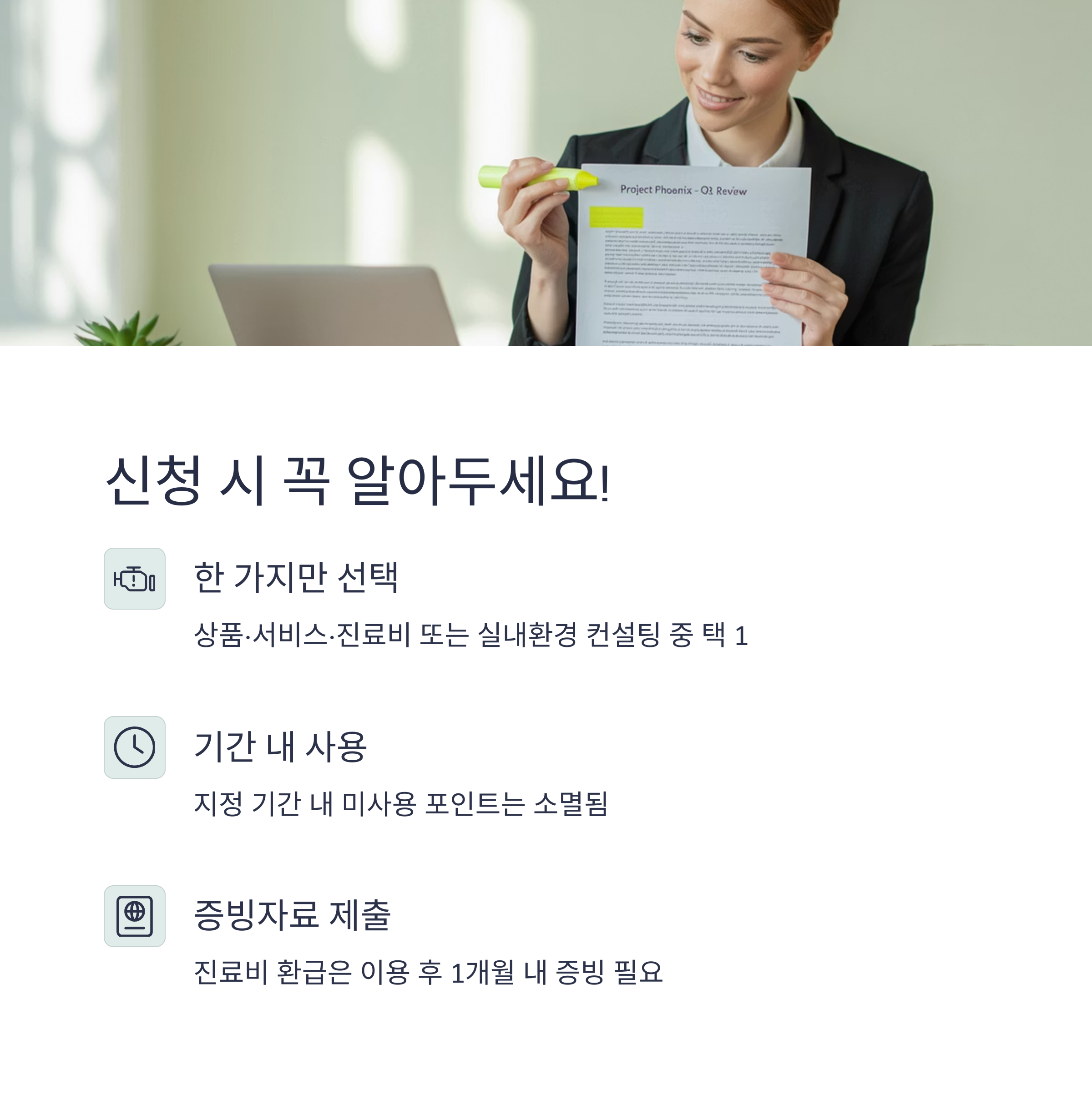 정기 신청 시 상품·서비스·진료비와 실내환경 컨설팅 중 한 가지만 신청 가능하며, 추가모집 시 중복 신청이 가능합니다. - Q. 포인트는 어떻게 사용하나요?