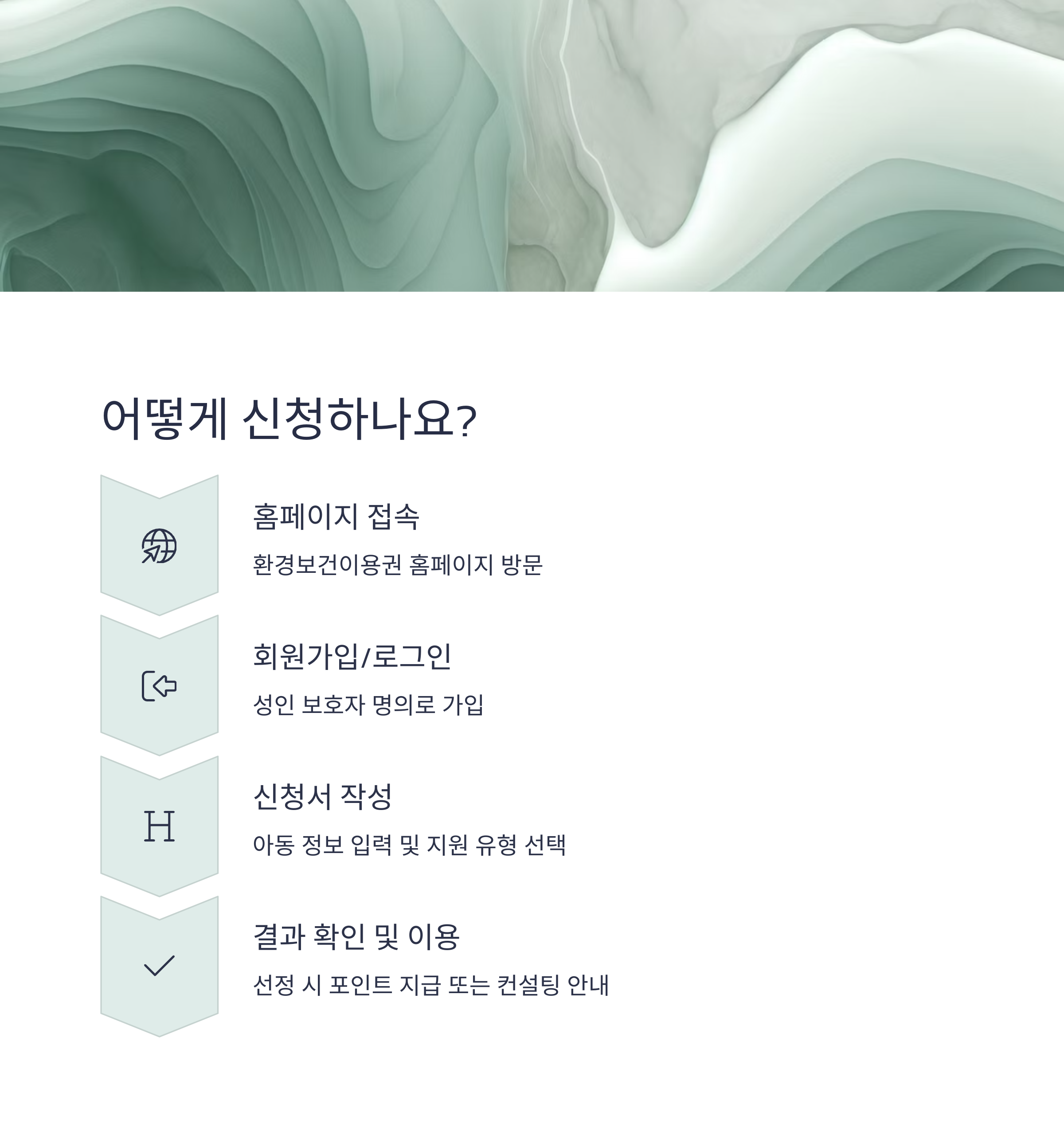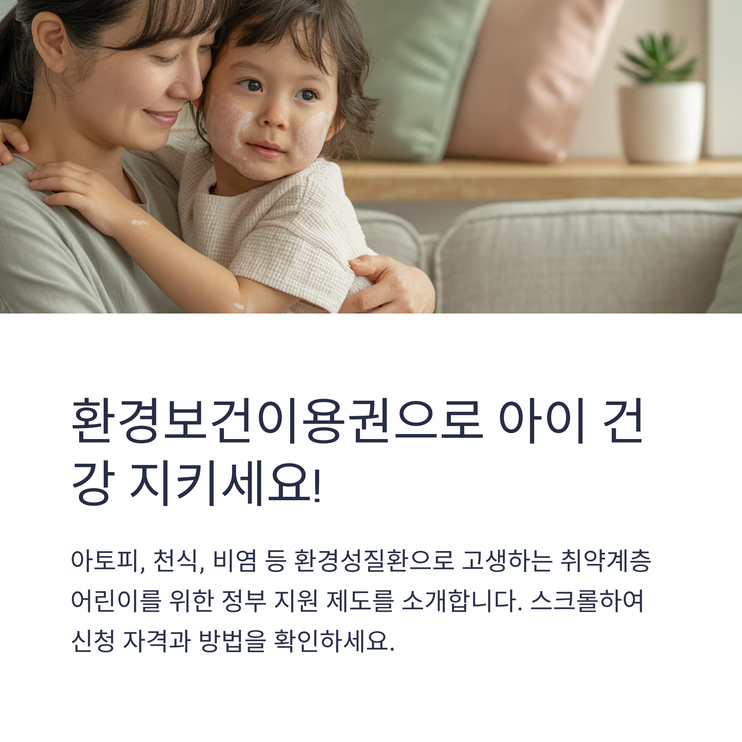 환경보건이용권은 환경성질환(아토피, 천식, 비염 등)으로 고생하는 취약계층 어린이의 건강을 지키고, 실내 환경을 개선하기 위해 정부가 지원하는 실질적인 복지 제도입니다. 2025년에는 기초생활수급자 가정의 13세 미만 어린이를 대상으로, 상품·서비스·진료비 지원 또는 실내환경 컨설팅 중 한 가지를 선택해 신청할 수 있습니다. 아래에서 신청 자격, 신청 방법, 지원 내용, 유의사항까지 꼼꼼하게 정리합니다.