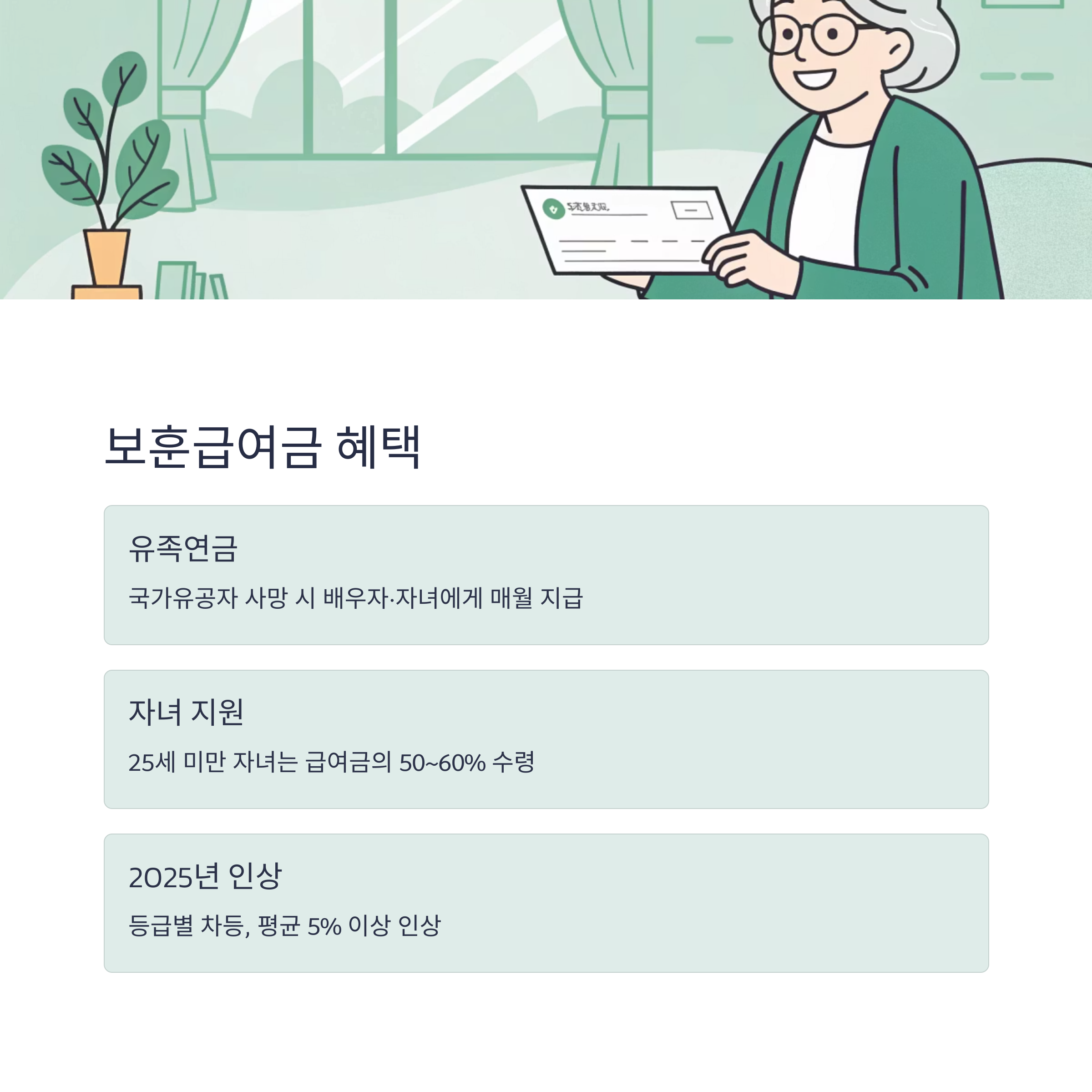 - 국가유공자 사망 시 배우자·자녀 등 유족에게 매월 보훈급여금 지급