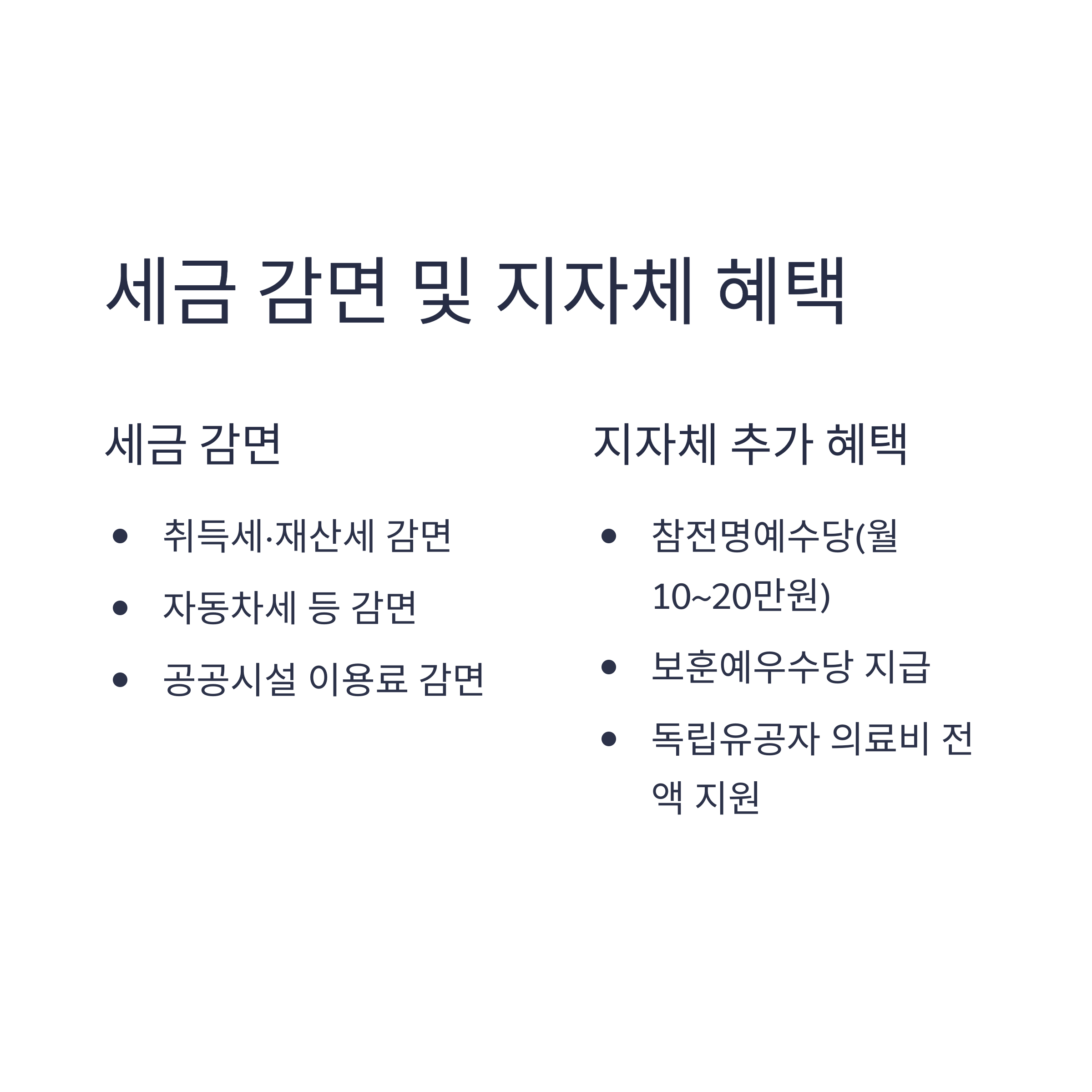 - 취득세·재산세·자동차세 등 각종 세금 감면