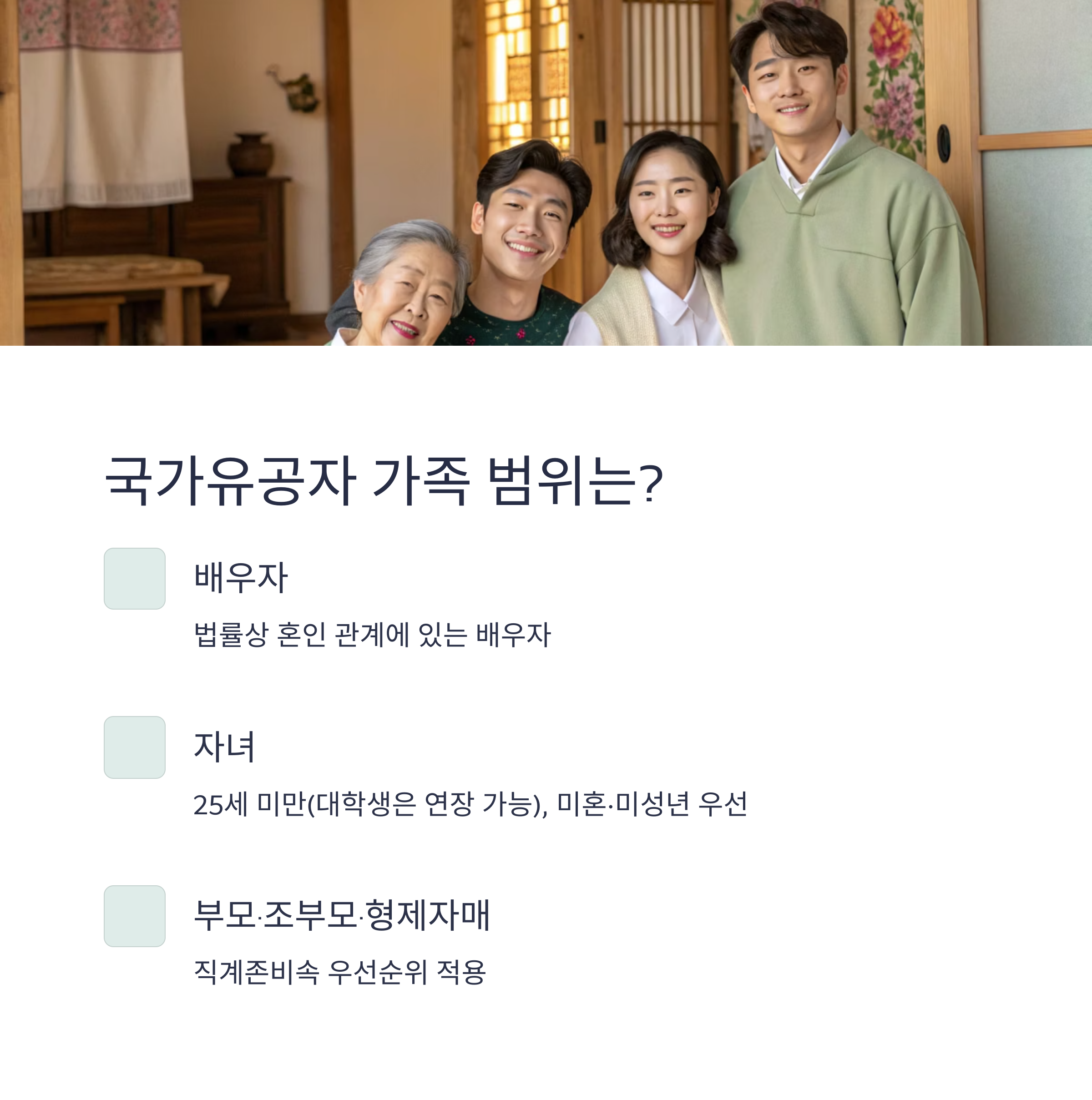 2025년 국가유공자 가족 혜택은 보훈급여금, 교육·취업·의료·주거·금융·복지 등 전방위로 확대되었습니다. 본인뿐 아니라 배우자, 자녀, 손자녀도 다양한 혜택을 받을 수 있으니, 국가보훈부·지자체·공공기관의 안내를 꼼꼼히 확인하고, 필요한 서류와 조건을 미리 준비해 적극적으로 신청하세요. 가족 모두가 국가유공자 예우를 온전히 누릴 수 있도록, 각종 지원정책과 변경사항을 주기적으로 확인하는 것이 중요합니다.