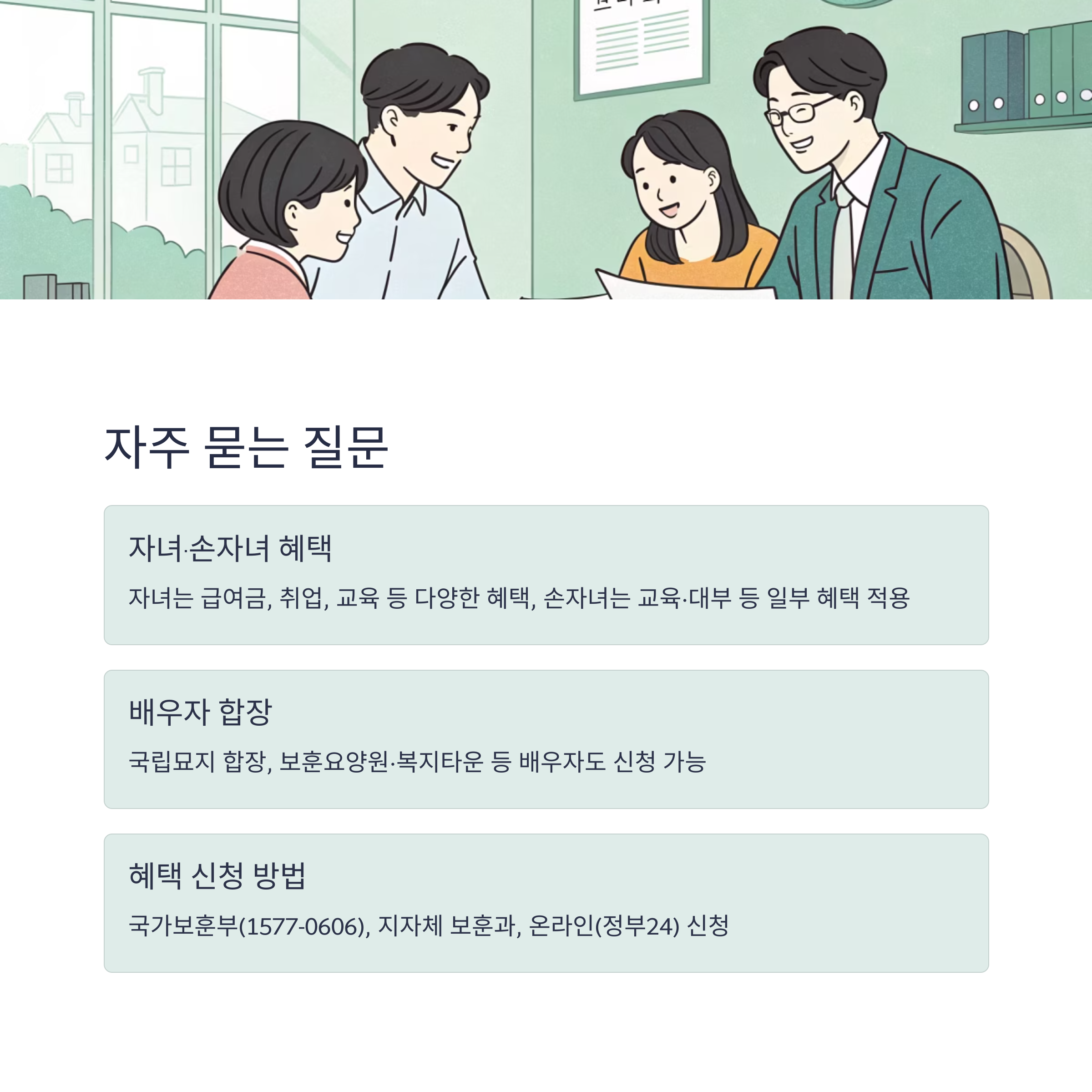 국립묘지 합장, 보훈요양원·복지타운 등은 배우자도 신청 가능하며, 사망 시 유족연금·복지 지원이 이어집니다. - Q. 혜택 신청은 어디서 하나요?