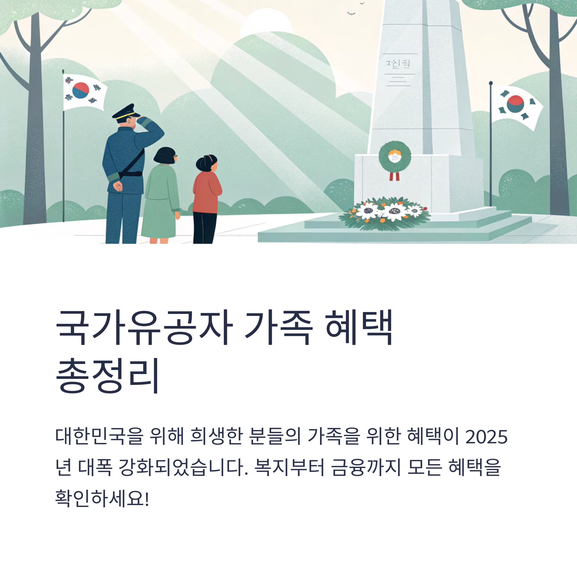 국가유공자 가족은 대한민국을 위해 희생·헌신한 분들의 유족, 배우자, 자녀, 부모 등 직계가족을 의미하며, 2025년에는 복지·의료·교육·주거·금융 등 다양한 분야에서 혜택이 대폭 강화되었습니다. 국가보훈부와 지방자치단체, 공공기관, 민간기업까지 협력해 지원 범위가 넓어졌으니, 아래에서 주요 혜택과 조건, 활용 팁까지 꼼꼼하게 확인하세요.