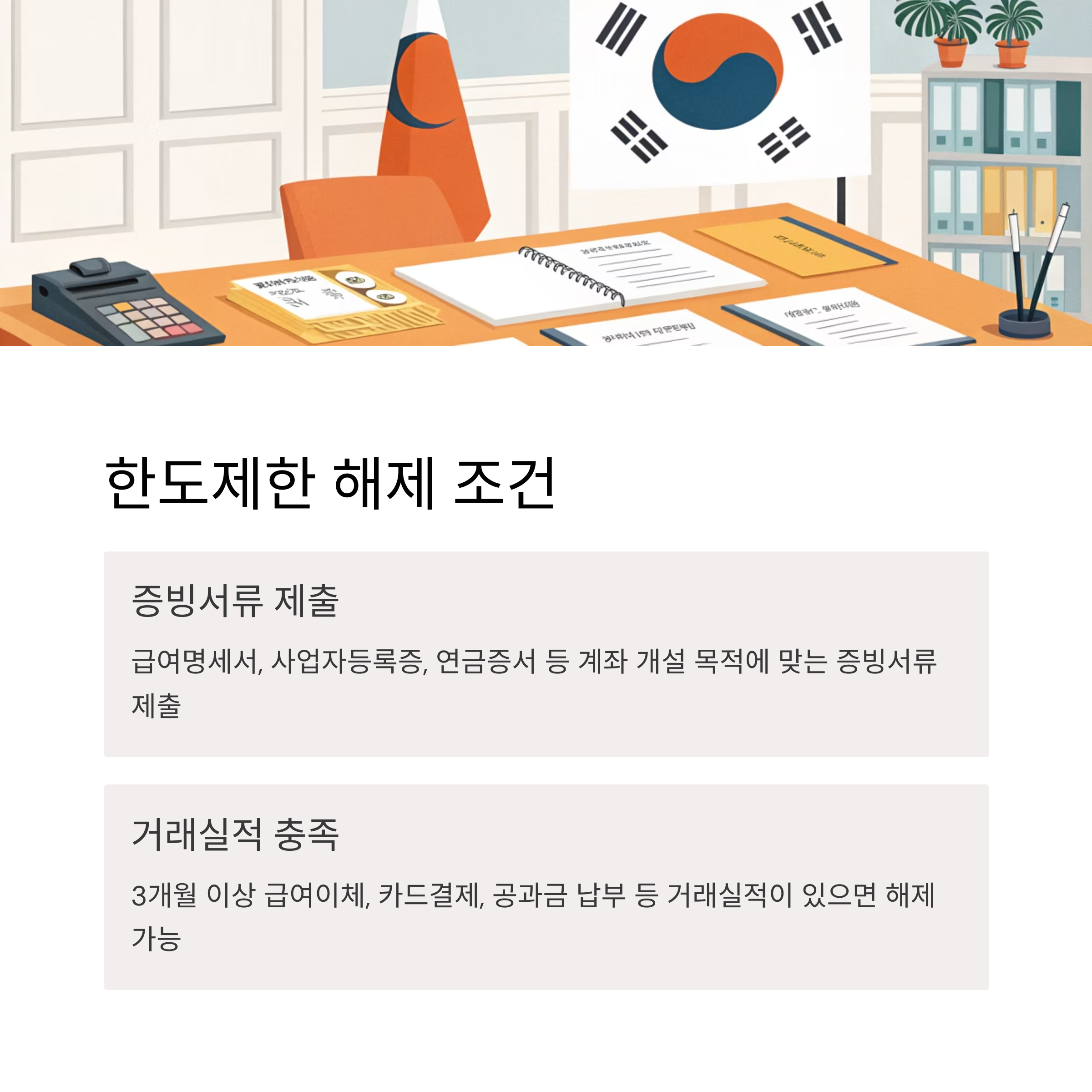 국민은행 한도제한계좌는 금융사기 예방을 위한 제도지만, 해제 절차가 까다롭지 않으니 조건을 충족했다면 온라인 또는 영업점에서 신속하게 일반 계좌로 전환하세요. 증빙서류와 거래실적을 꼼꼼히 준비하면 빠르게 해제할 수 있습니다.