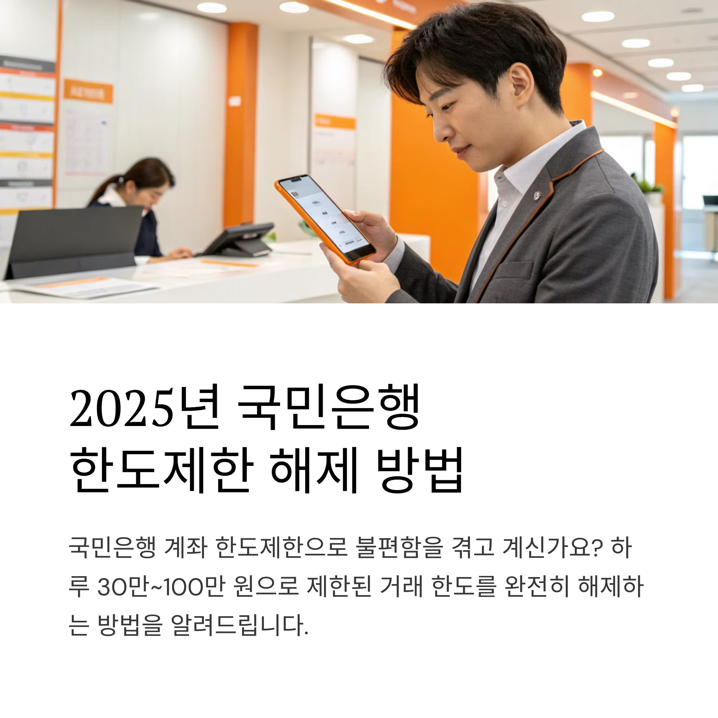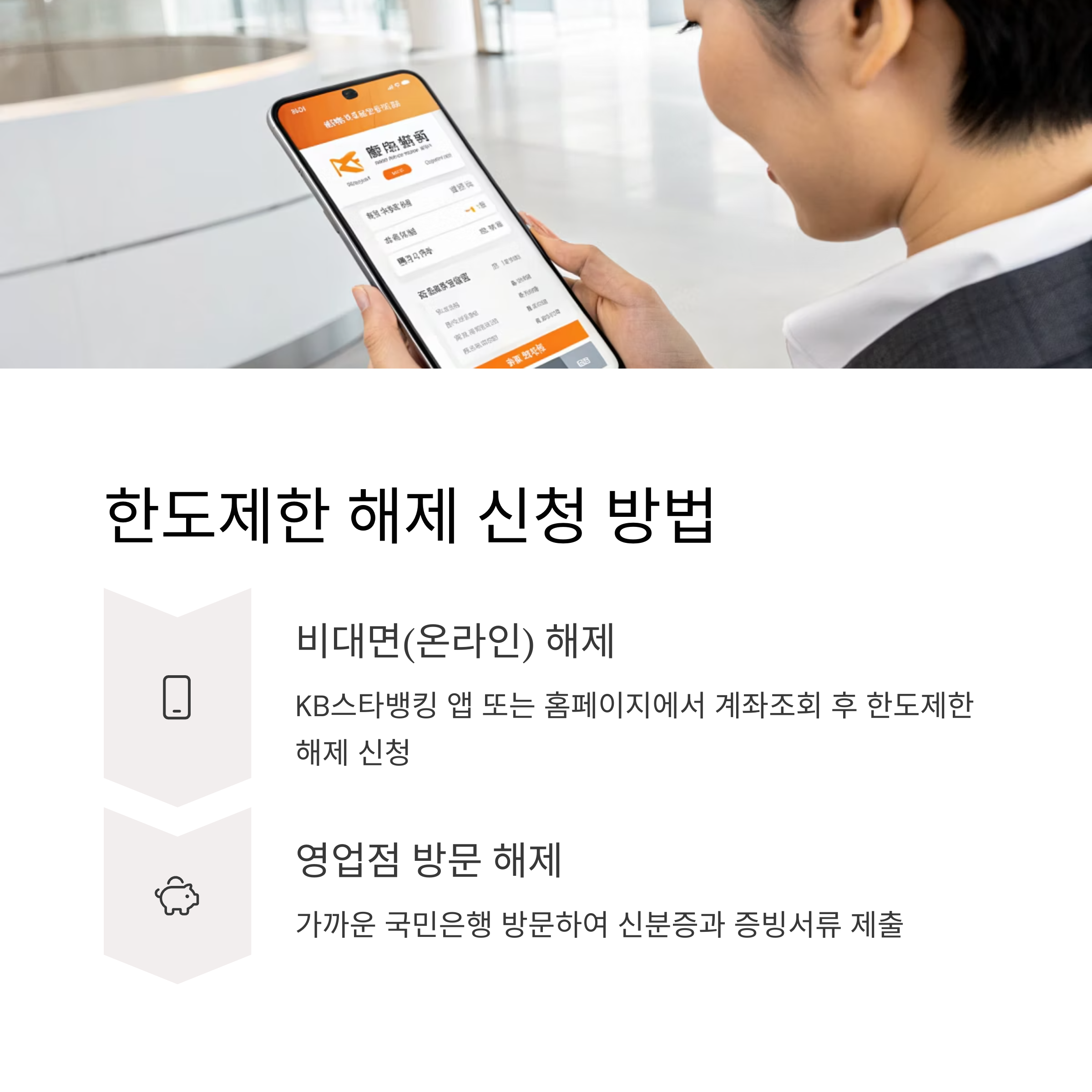 - 가까운 국민은행 영업점 방문 → 신분증과 증빙서류 제출 → 직원 안내에 따라 한도제한 해제 신청