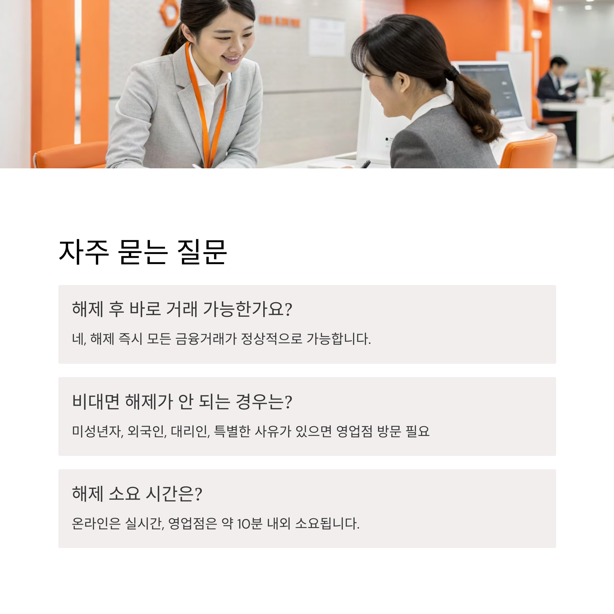 A. 온라인 신청 시 실시간, 영업점 방문 시 서류 이상 없으면 10분 내외로 처리됩니다. - Q. 해제 후에도 한도가 남아있다면?
