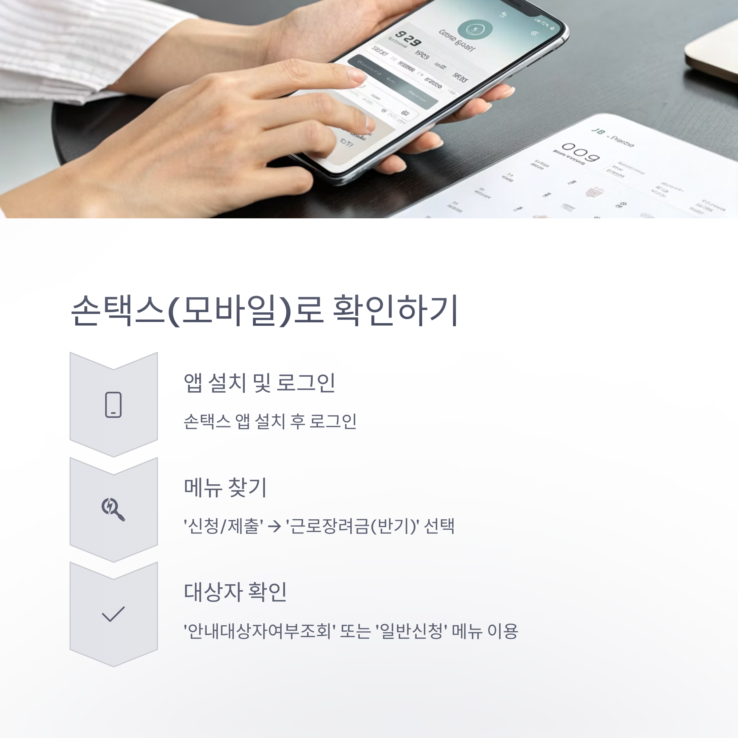 - ‘복지이음(근로·자녀장려금)’ → ‘반기 근로장려금’ → ‘신청안내대상 여부 조회’ 메뉴 활용