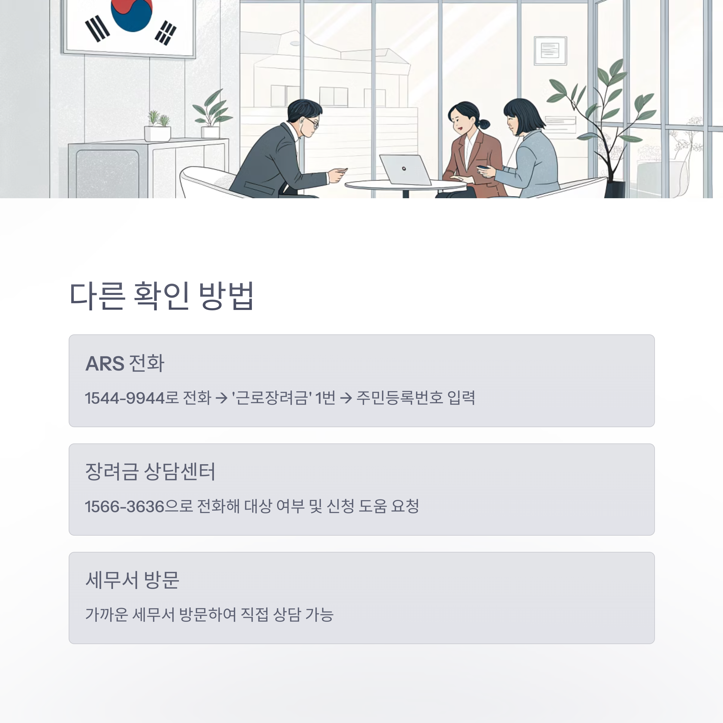 - 1544-9944 전화 → ‘근로장려금’ 1번 → 주민등록번호 입력