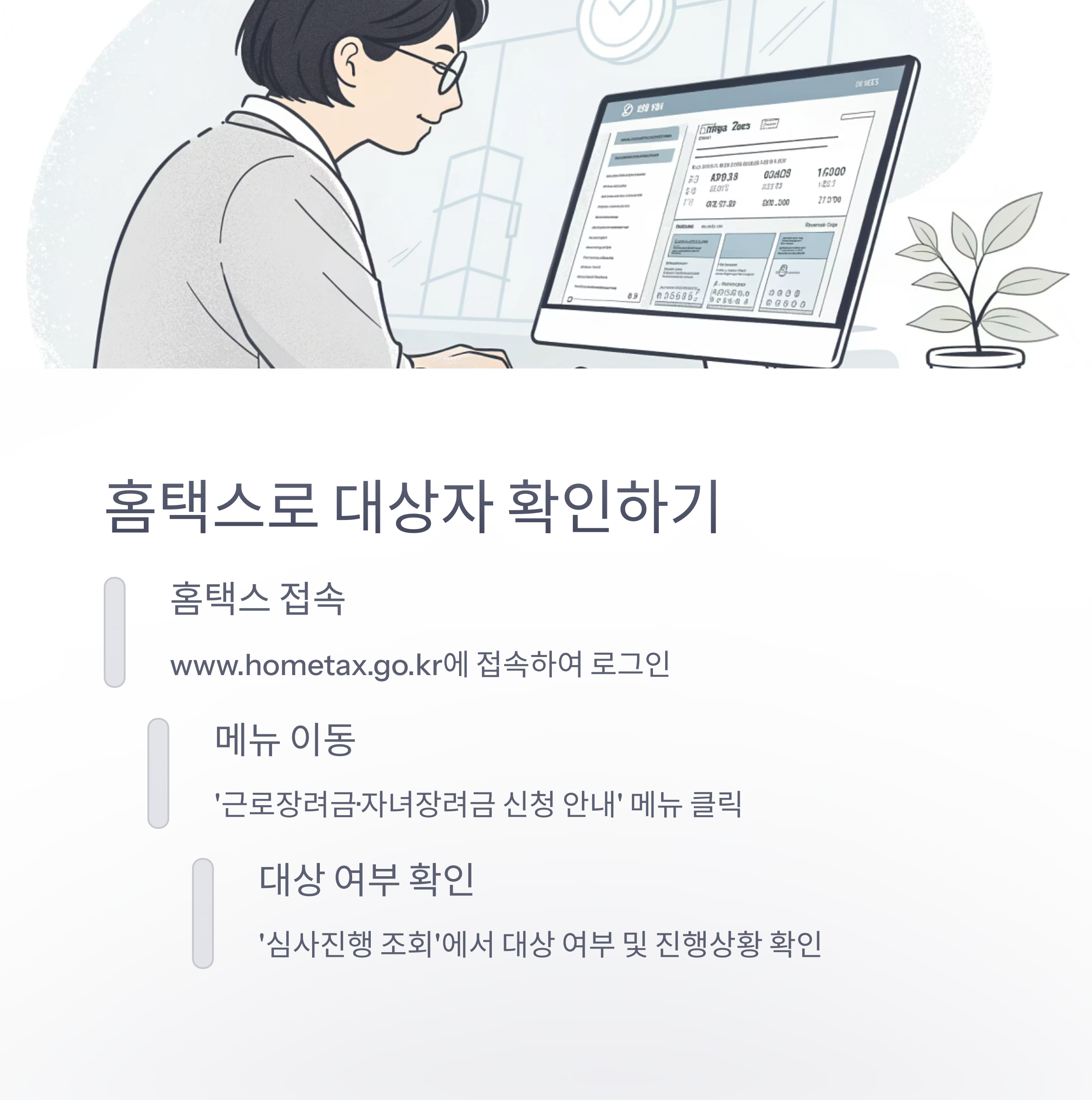 홈택스 ‘신청요건 세부내용’ 또는 ‘장려금 미리 계산해보기’ 메뉴에서 확인할 수 있습니다. - Q. 대상이 아니라면 이유를 알 수 있나요?
