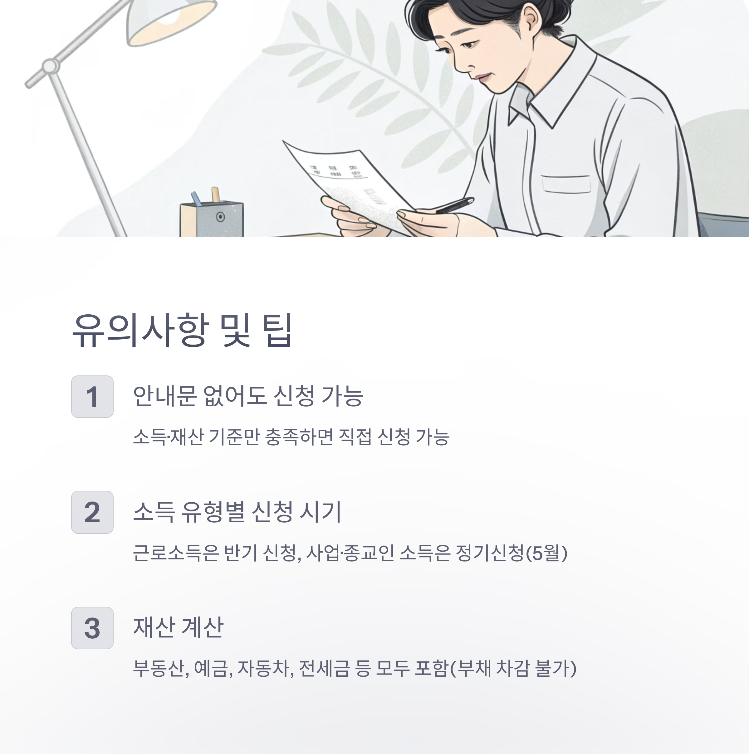- 안내문을 받지 못해도 소득·재산 기준만 충족하면 직접 신청 가능