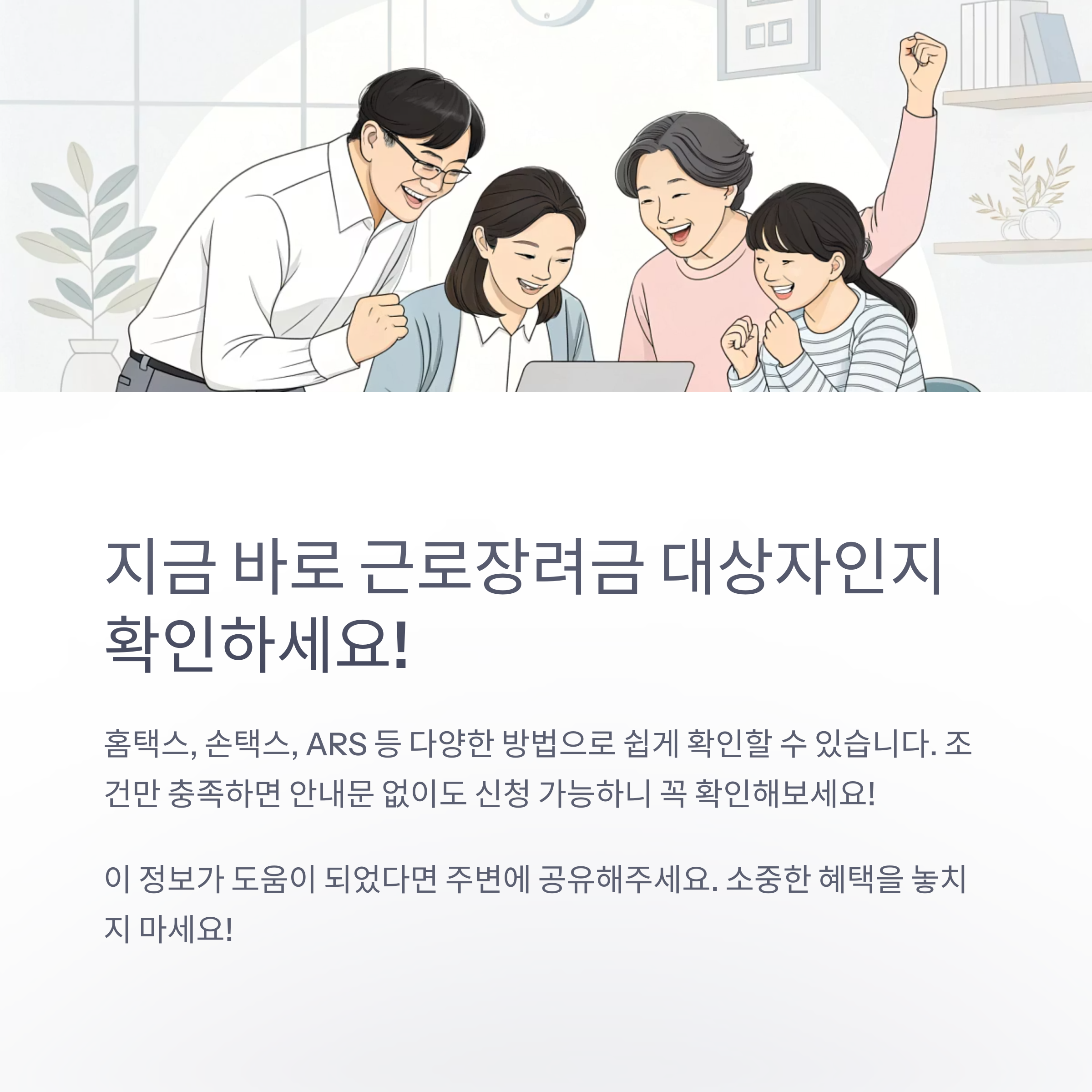 근로장려금 대상자 확인은 홈택스, 손택스, ARS, 상담센터 등 다양한 방법으로 간편하게 할 수 있습니다. 안내문을 받지 못했더라도 조건만 충족하면 직접 신청이 가능하니, 소득·재산 기준을 꼼꼼히 확인하고 꼭 신청하세요. 궁금한 점은 장려금 상담센터나 세무서에 문의하면 빠르게 안내받을 수 있습니다.