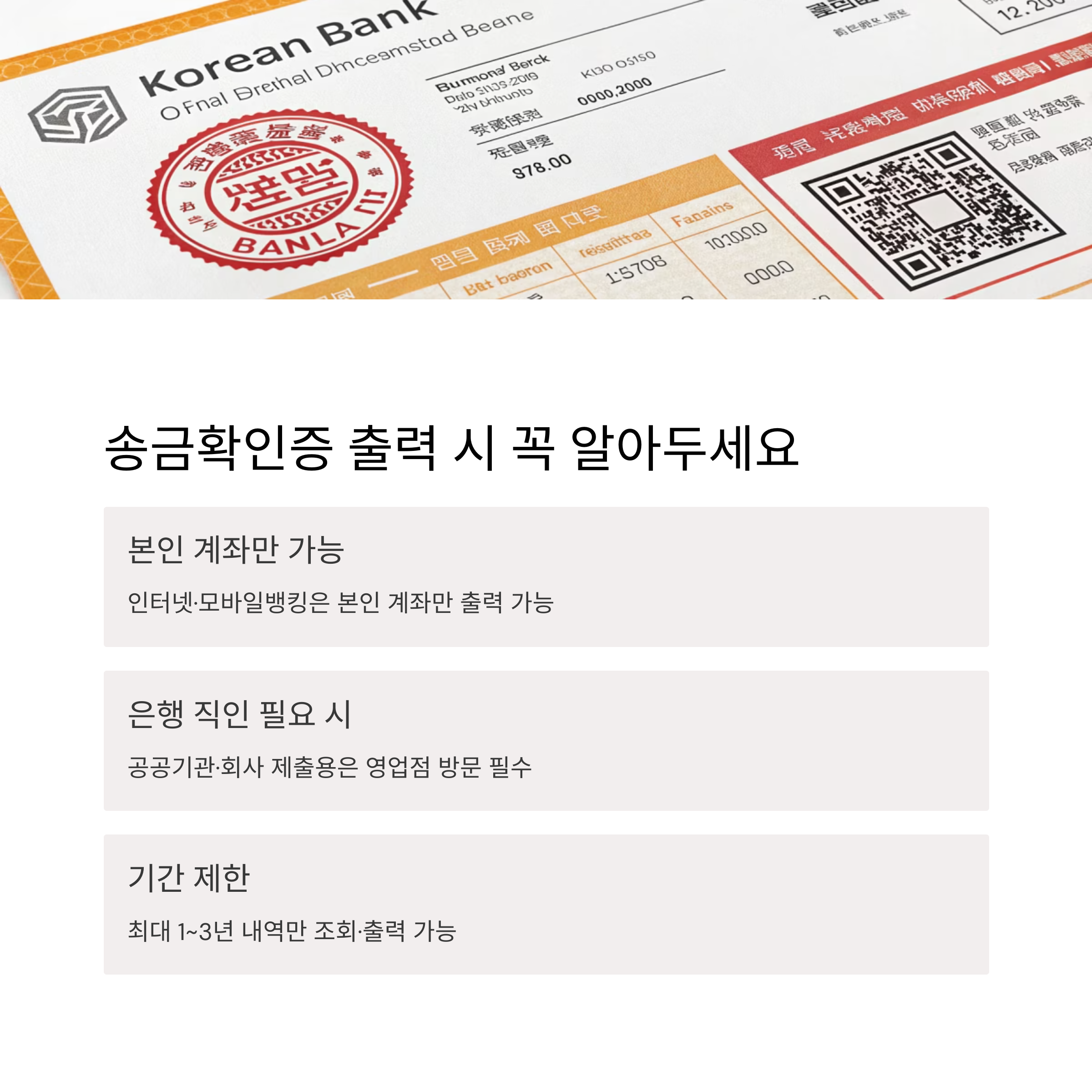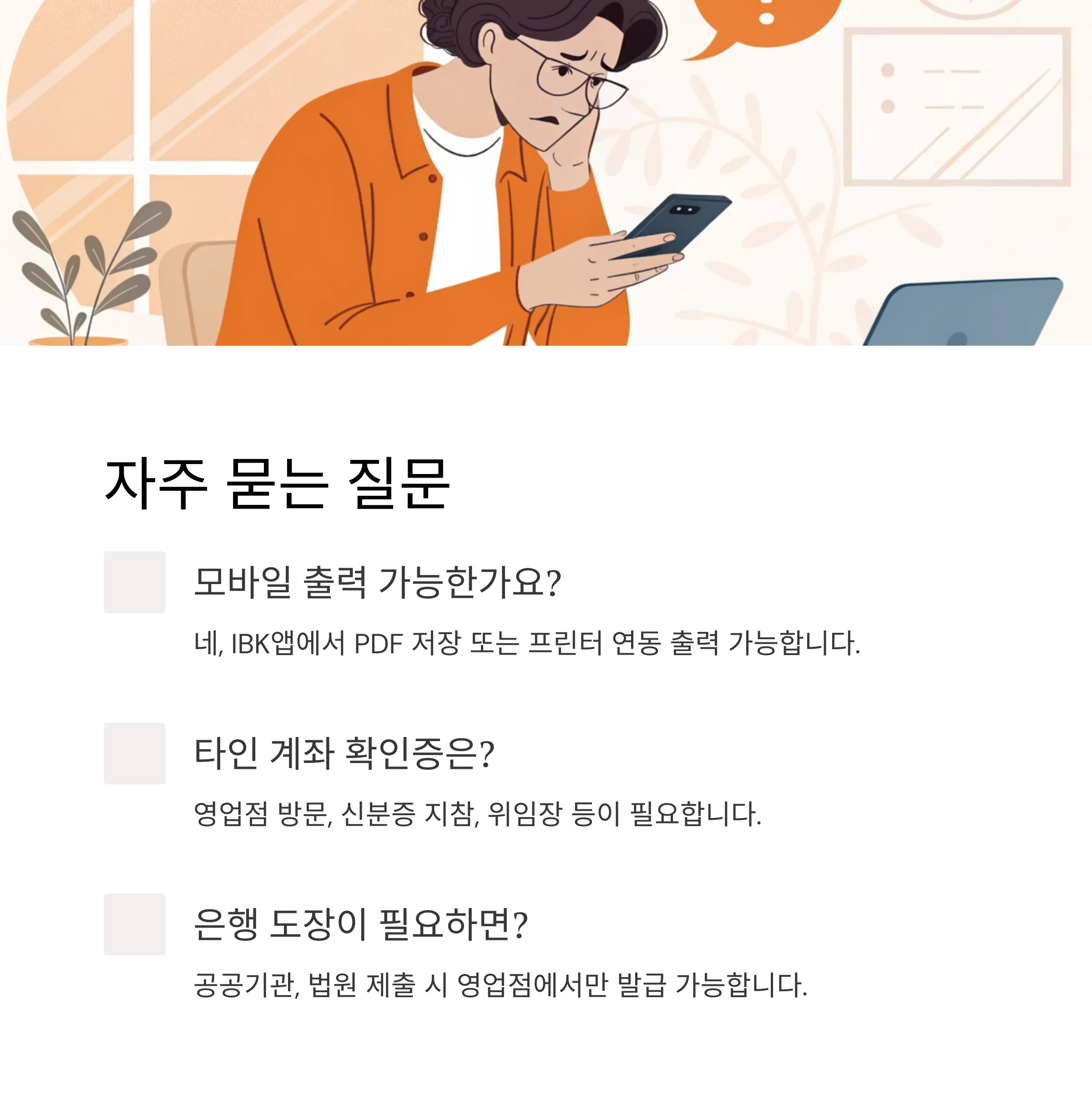 - 공공기관·회사 제출용은 은행 직인(도장) 필요 시 반드시 영업점 방문 발급