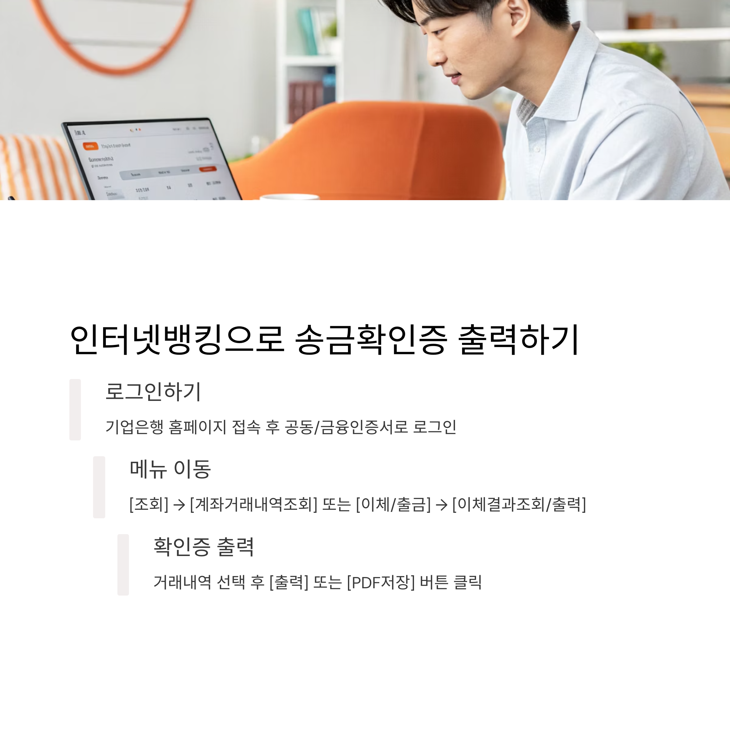 기업은행 송금확인증(이체확인증)은 인터넷뱅킹, 모바일뱅킹, 영업점 등에서 간편하게 출력·발급받을 수 있습니다. 제출처 요구에 따라 은행 도장, PDF 파일 등 형식을 미리 확인하고, 출력 기간·내역도 꼼꼼히 체크하세요. 모바일로 저장한 PDF 파일은 이메일, 메신저 등으로 제출하면 편리합니다.