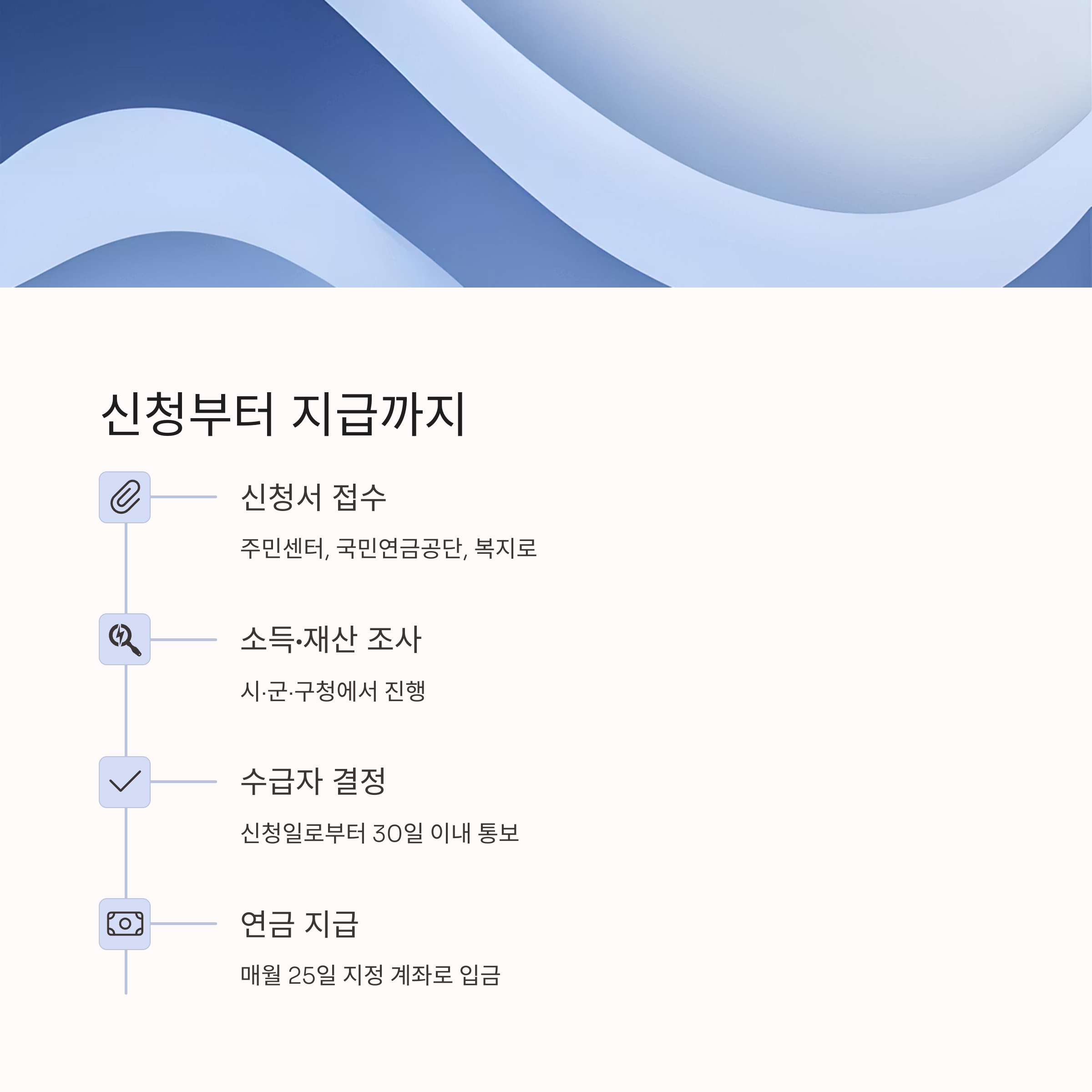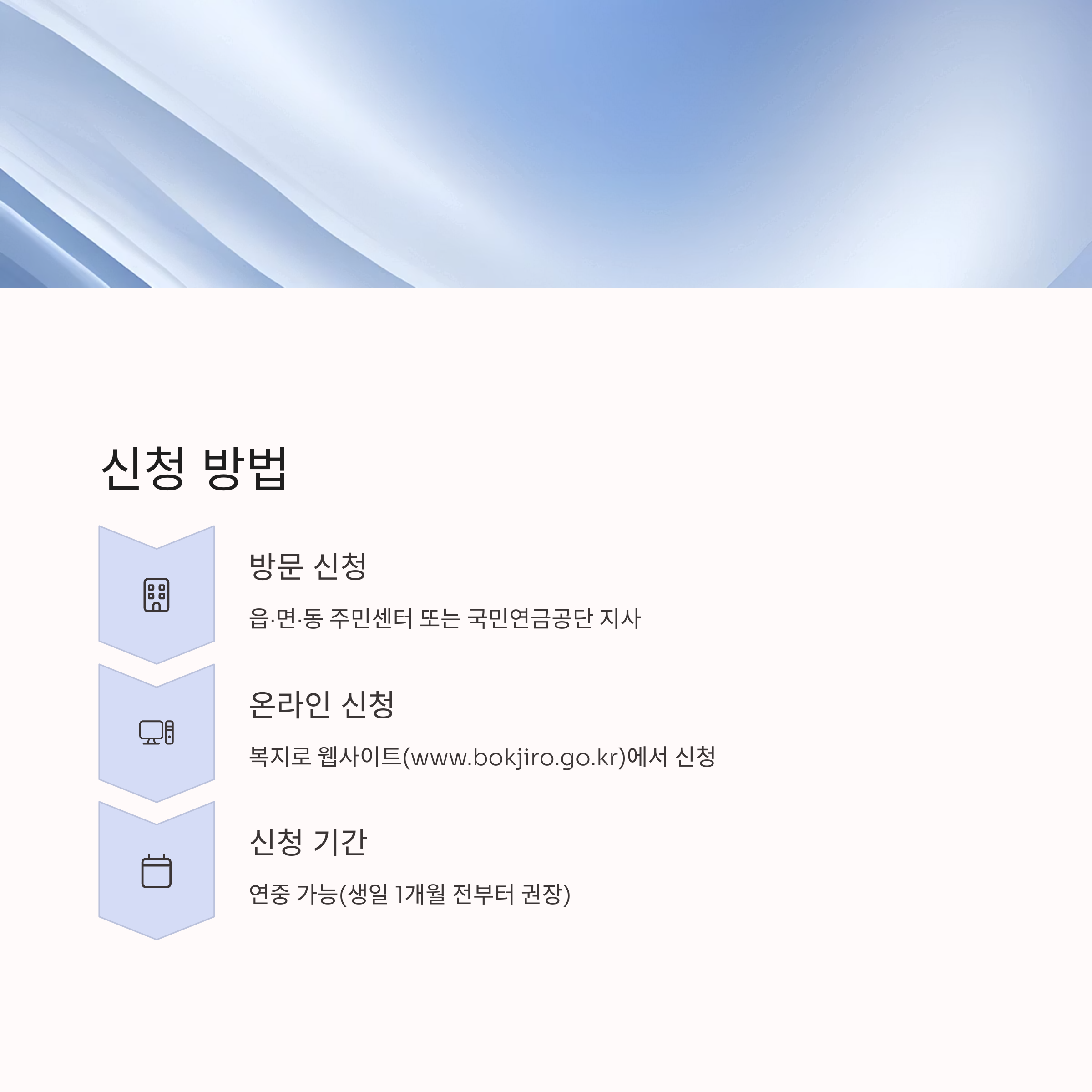 - 신청서 및 구비서류 접수(주민센터, 국민연금공단, 복지로)