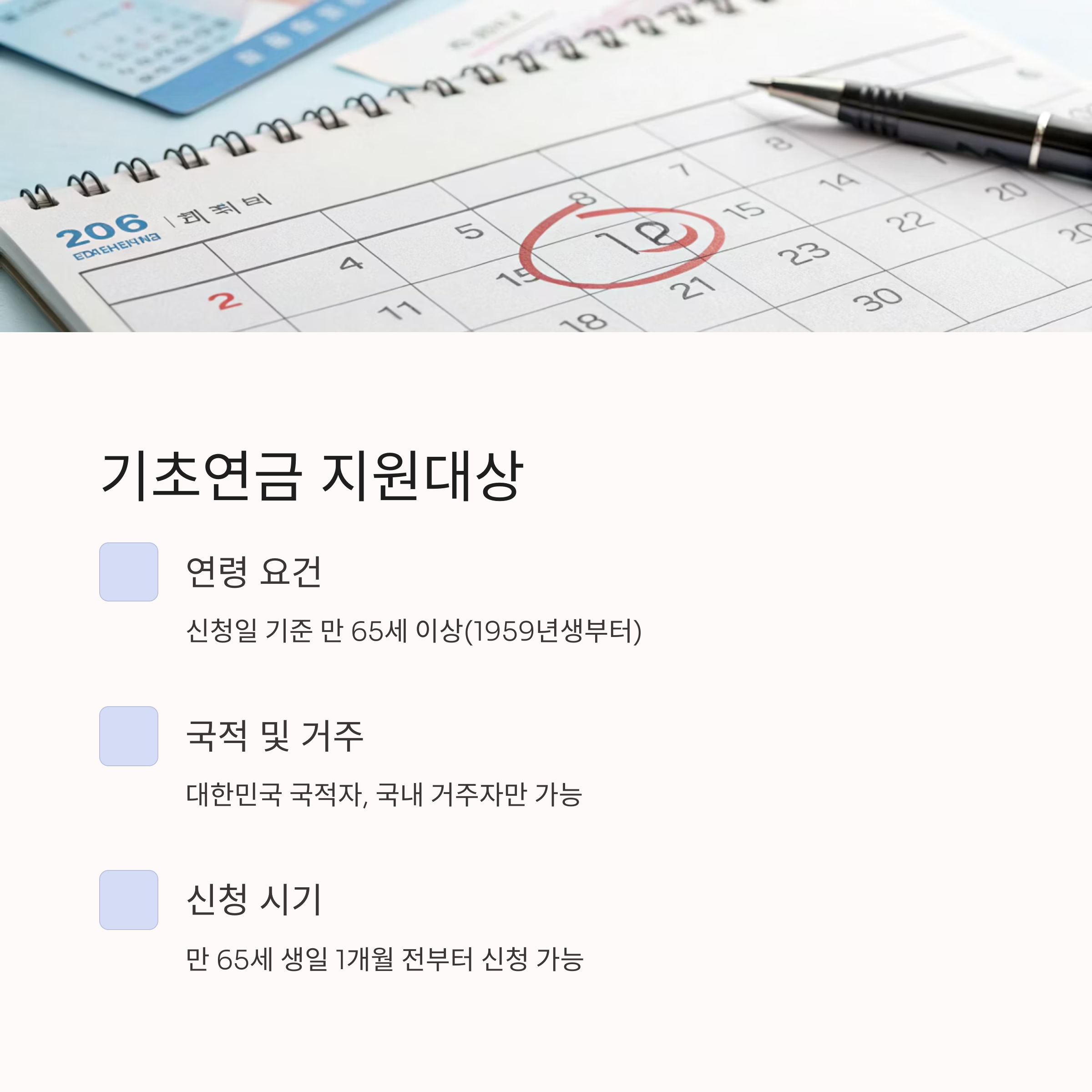 - 연령 요건: 신청일 기준 만 65세 이상(1959년생부터 해당)