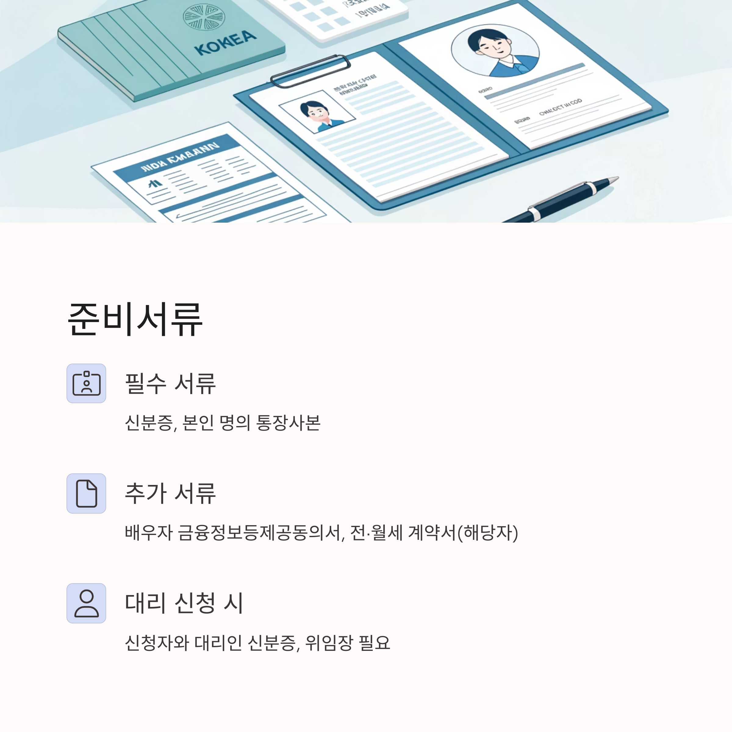 - 대리 신청 시: 신청자와 대리인 신분증, 위임장