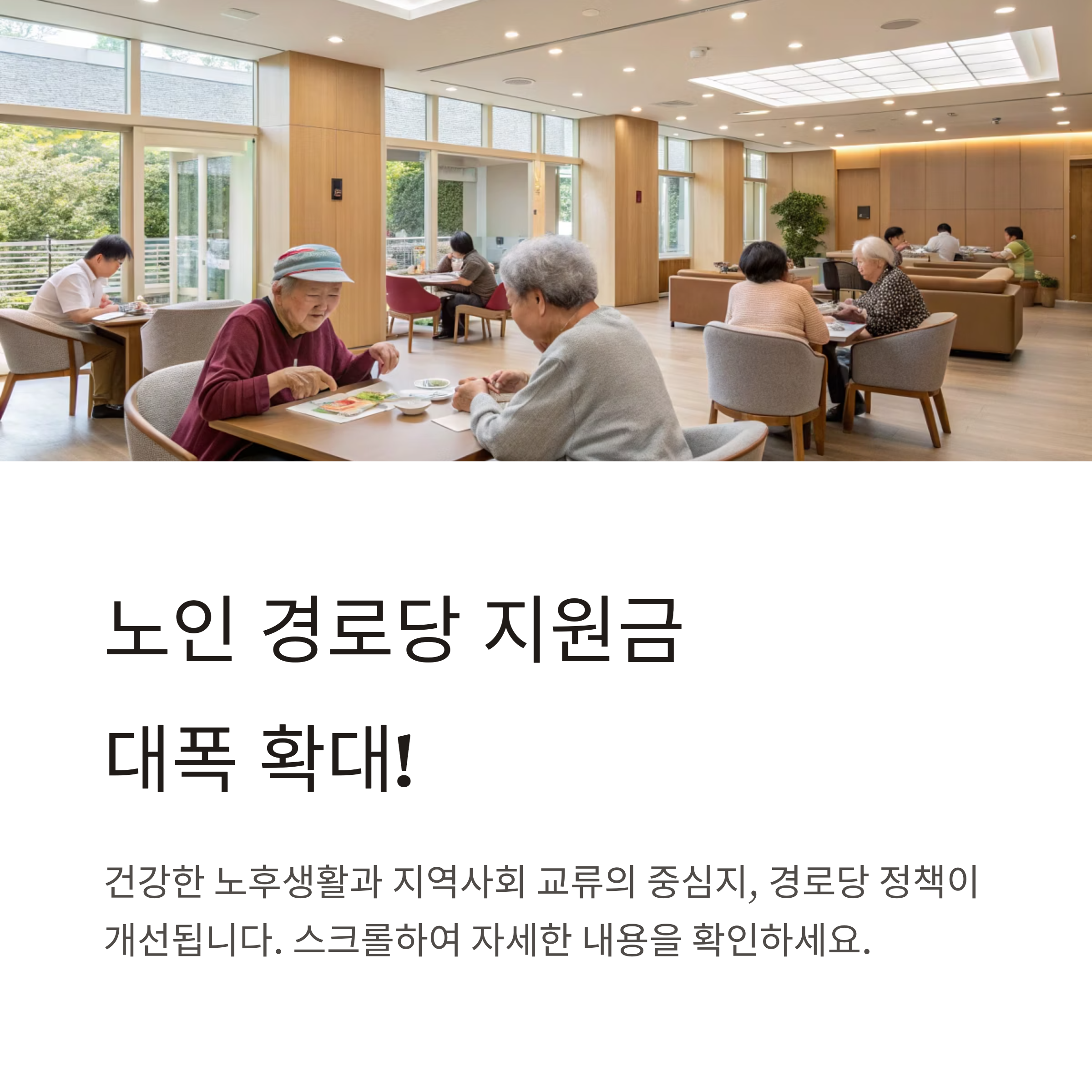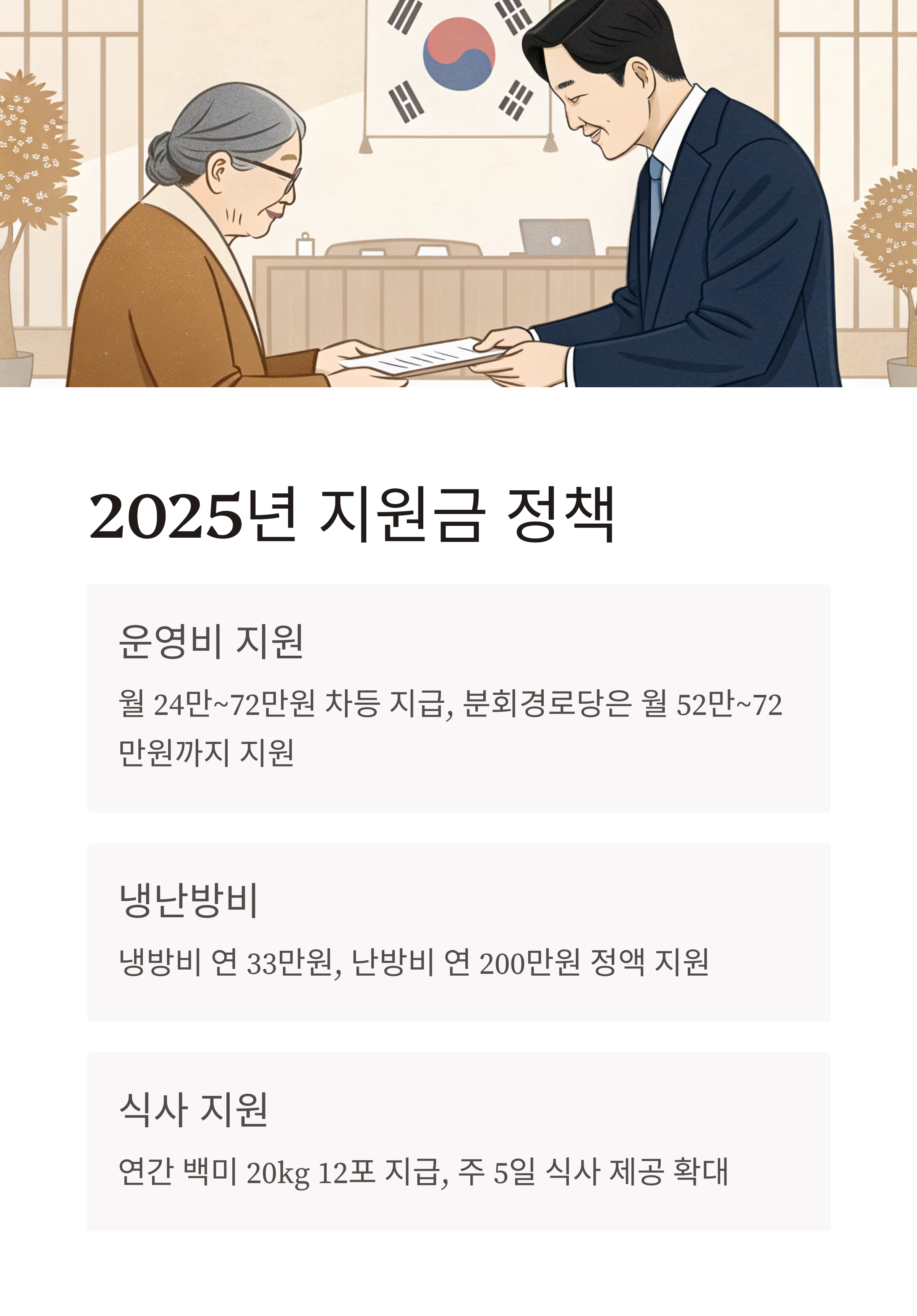 경로당은 우리나라 노인들이 가장 많이 이용하는 대표적인 여가·복지시설로, 건강한 노후생활과 지역사회 교류의 중심지 역할을 하고 있습니다. 2025년에는 경로당의 기능과 환경이 대폭 개선되고, 식사·운영비·냉난방비 등 다양한 지원금이 확대됩니다. 아래에서 경로당 이용 방법, 지원금 내역, 주요 정책 변화, 신청 절차, 주의사항 등 꼭 필요한 정보를 꼼꼼하게 안내합니다.