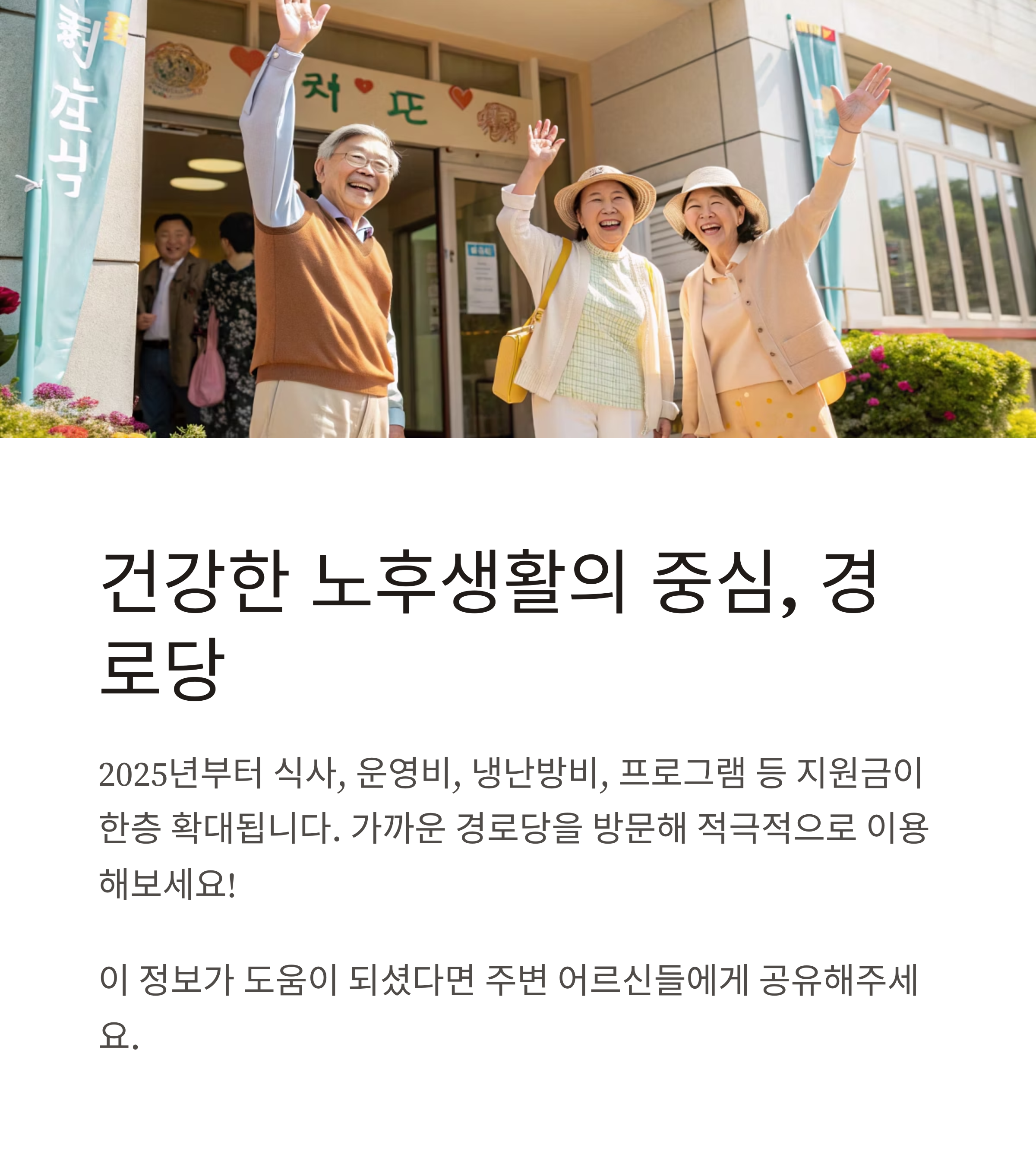 경로당은 어르신의 건강한 노후와 사회적 교류, 여가·복지의 중심지입니다. 2025년부터는 식사, 운영비, 냉난방비, 프로그램 등 지원금이 한층 확대되고, 다양한 맞춤형 복지서비스가 제공됩니다. 가까운 경로당을 방문해 회원가입 후 적극적으로 이용해보세요. 경로당 운영진은 지원금 신청 및 집행, 프로그램 운영에 관한 사항을 꼭 숙지하시기 바랍니다.