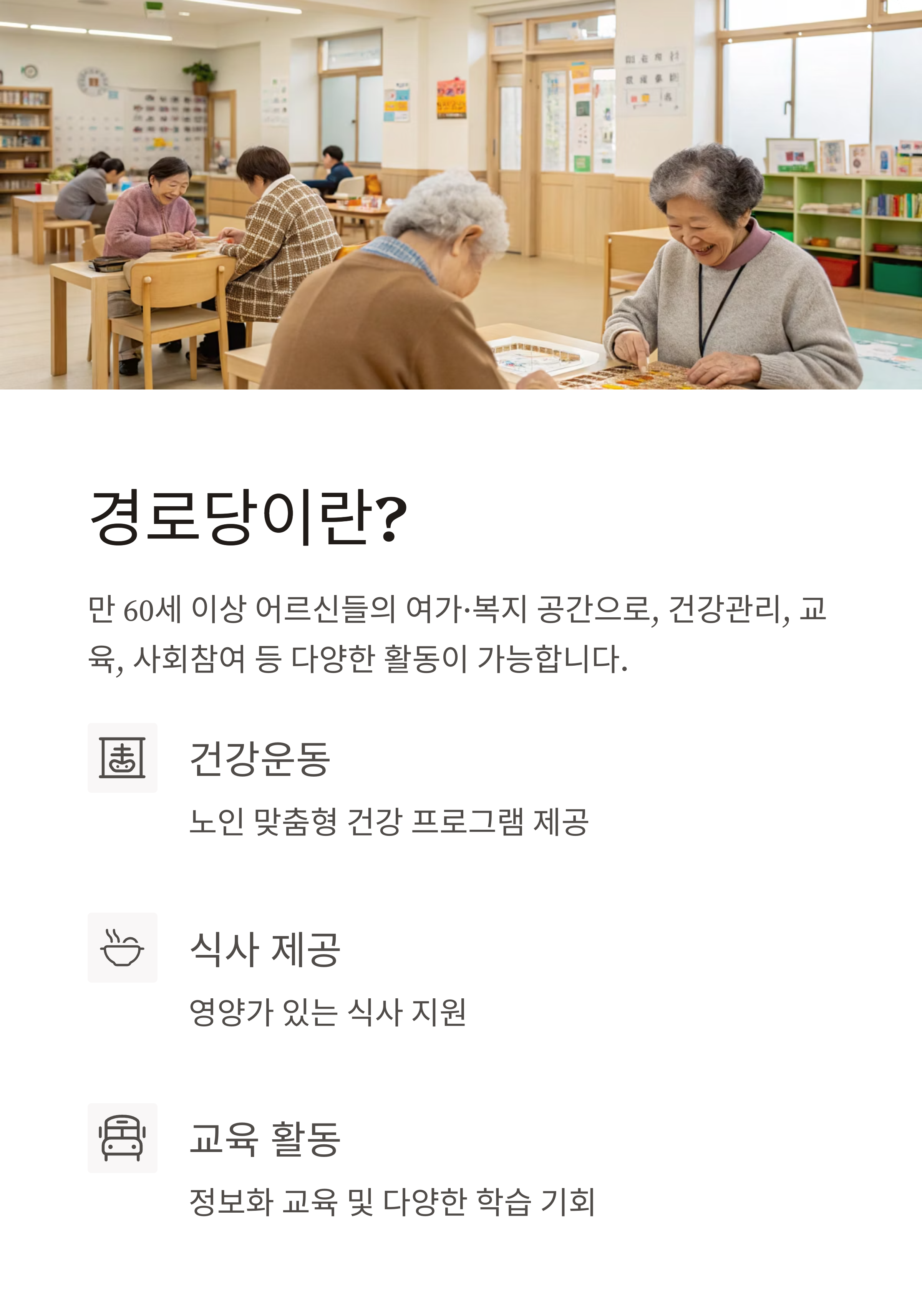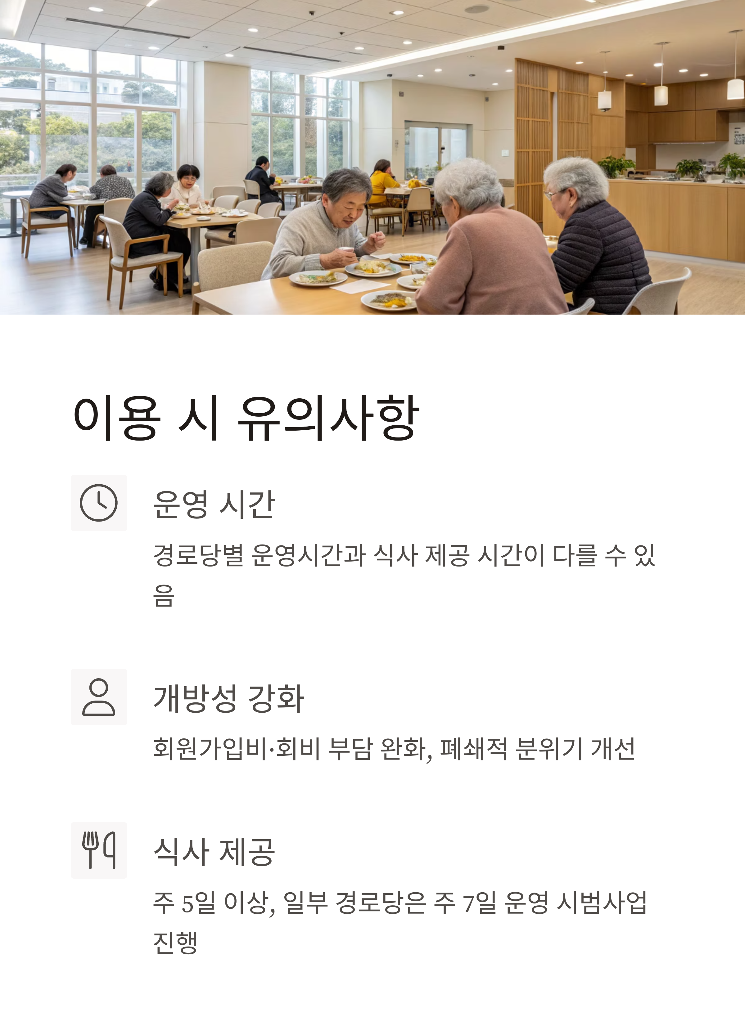 - 경로당별로 운영시간, 식사 제공, 프로그램 내용이 다를 수 있으니 방문 전 확인 필요