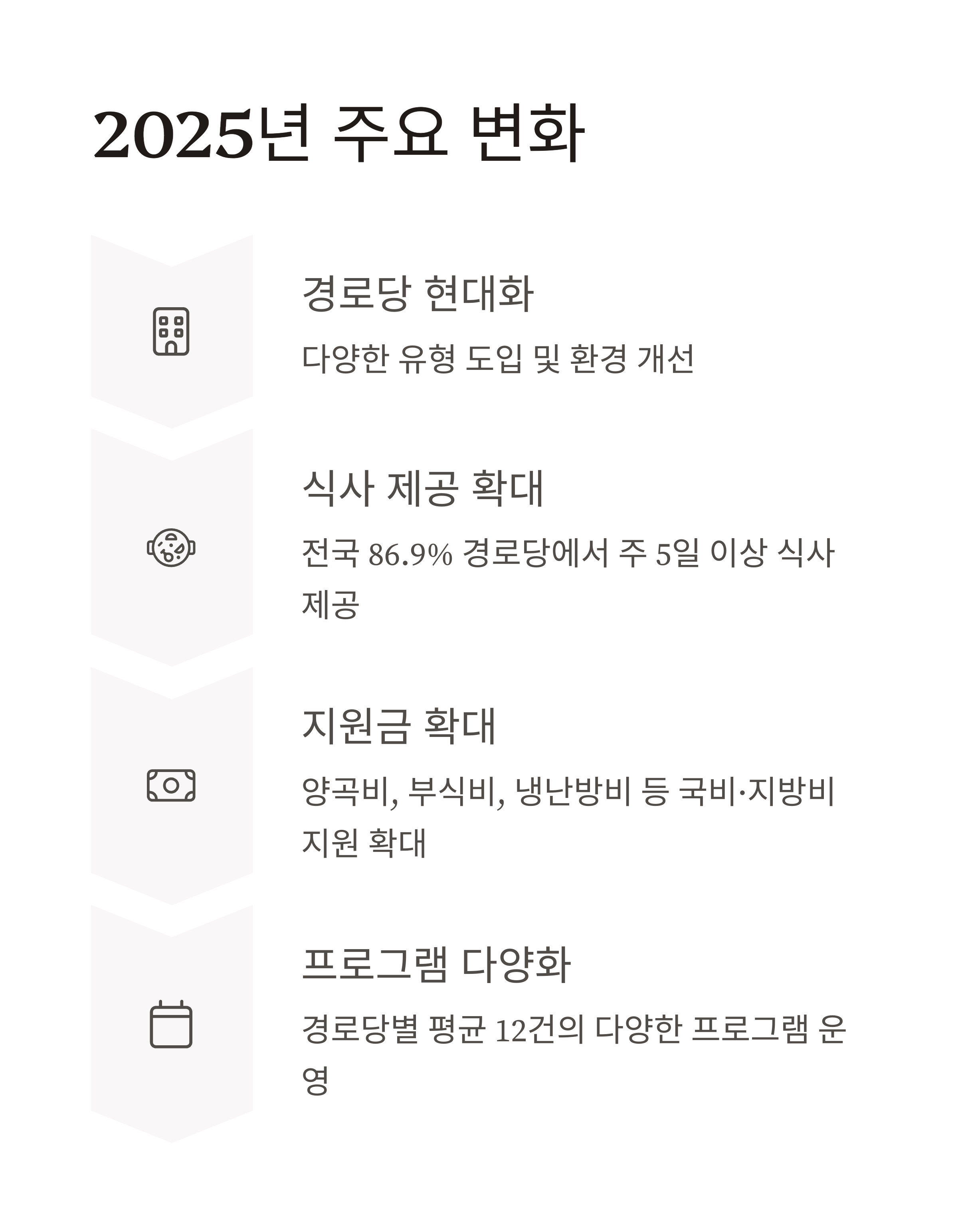 - 식사 제공 확대: 전국 경로당 86.9%에서 식사 제공, 2025년부터 주 5일 이상 식사 제공 추진