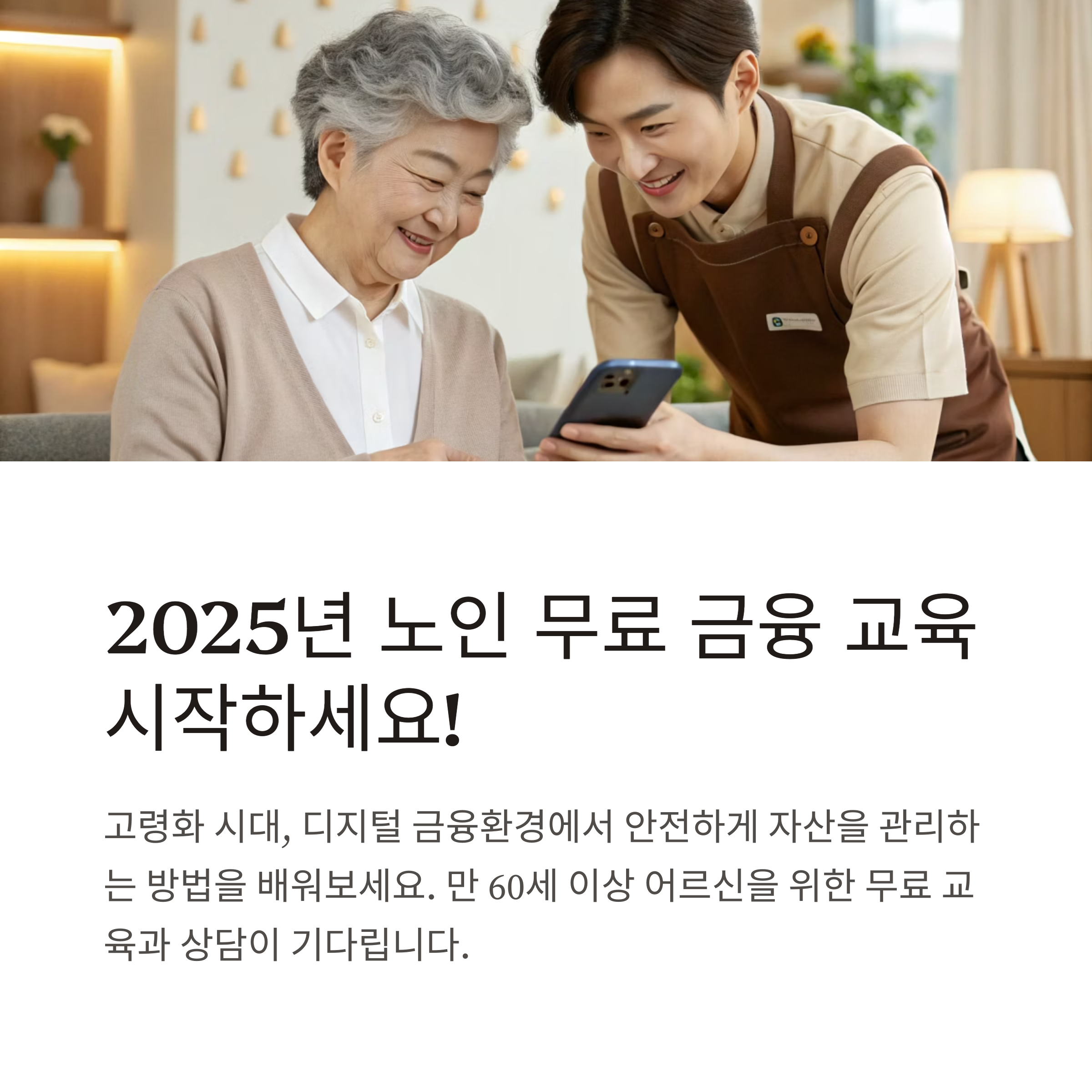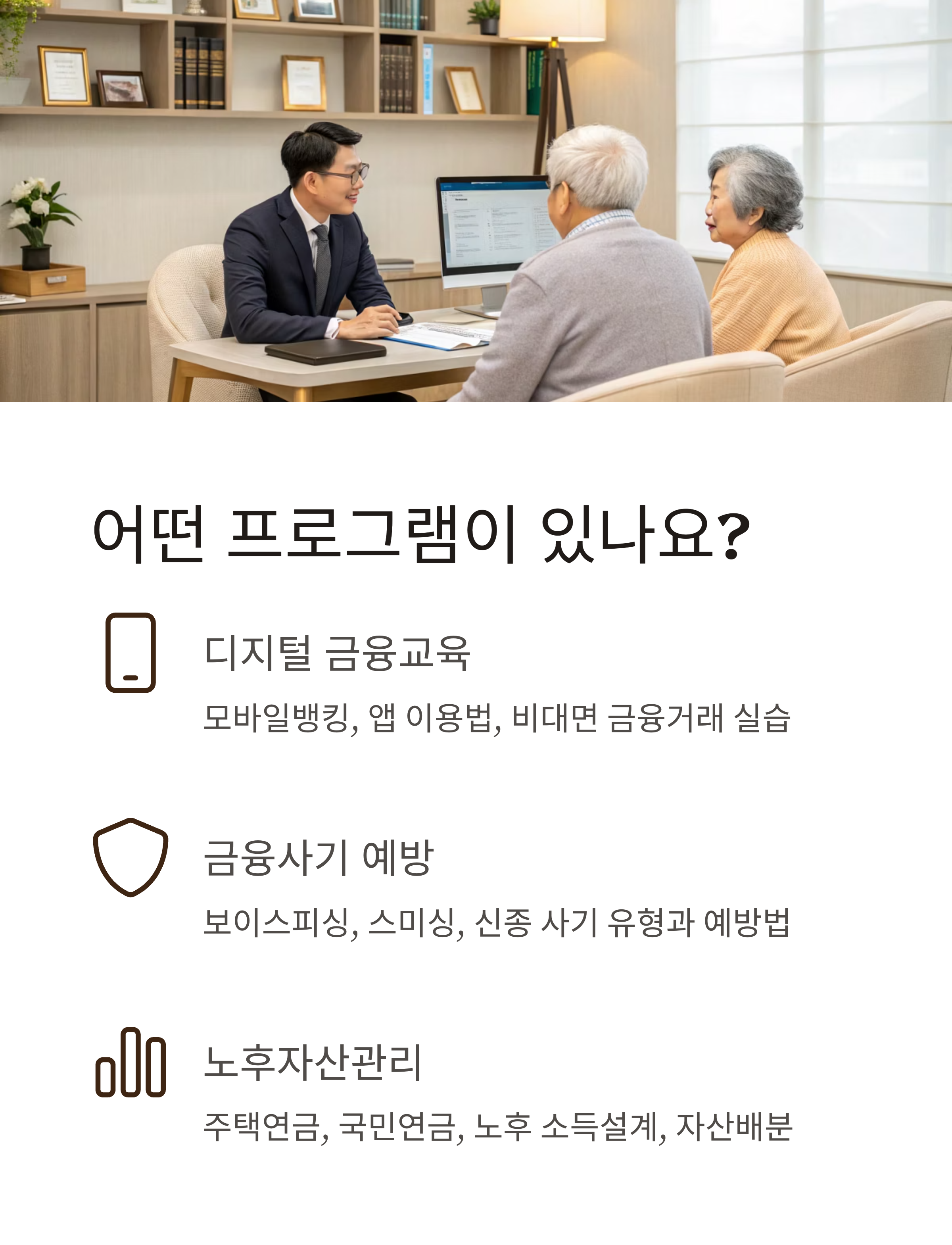 만 60세 또는 65세 이상 어르신을 대상으로, 복지관·금융기관·공공기관 등에서 디지털 금융, 금융사기 예방, 노후자산관리, 부채관리, 연금·보험 등 다양한 주제로 무료 금융 교육과 전문가 1:1 상담을 제공하는 복지 서비스입니다. 현장 집합교육, 찾아가는 교육, 온라인 강의, 금융전문가와의 일대일 상담 등 다양한 방식으로 운영됩니다.